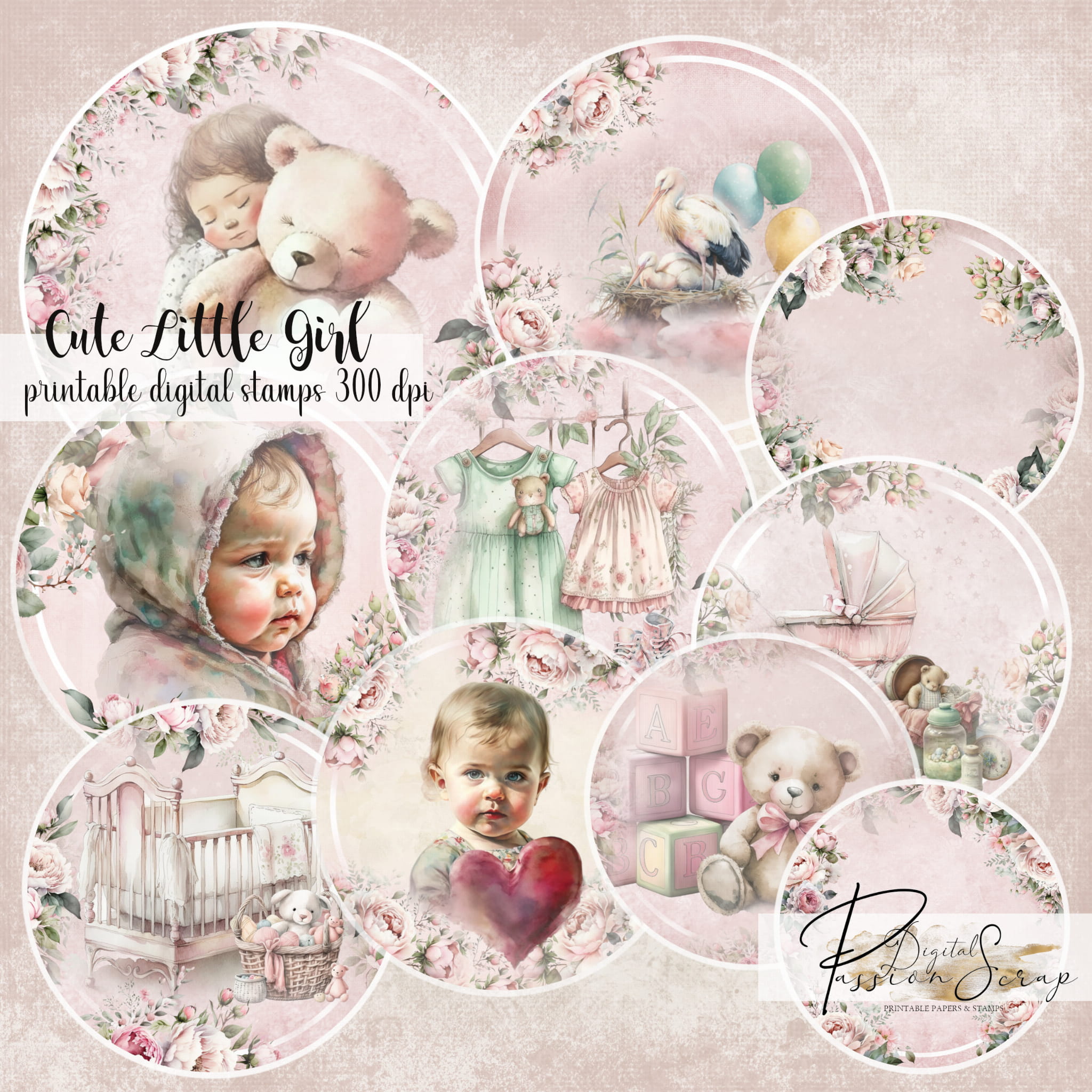 Cute Little Girl - 10 osobnych digi stempli PNG do samodzielnego wydruku w jakości 300 DPI