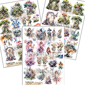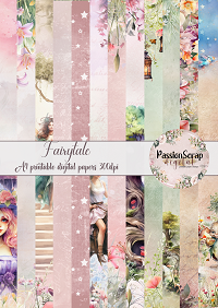 Fairytale MEGA PAKA- 12 osobnych digi papierów PNG w formacie kwadratowym, 12 osobnych digi papierów PNF w formacie A4, 10 osobnych digi stempli PNG do samodzielnego wydruku w jakości 300 DPI, 3 arkusze grafik do wycinania