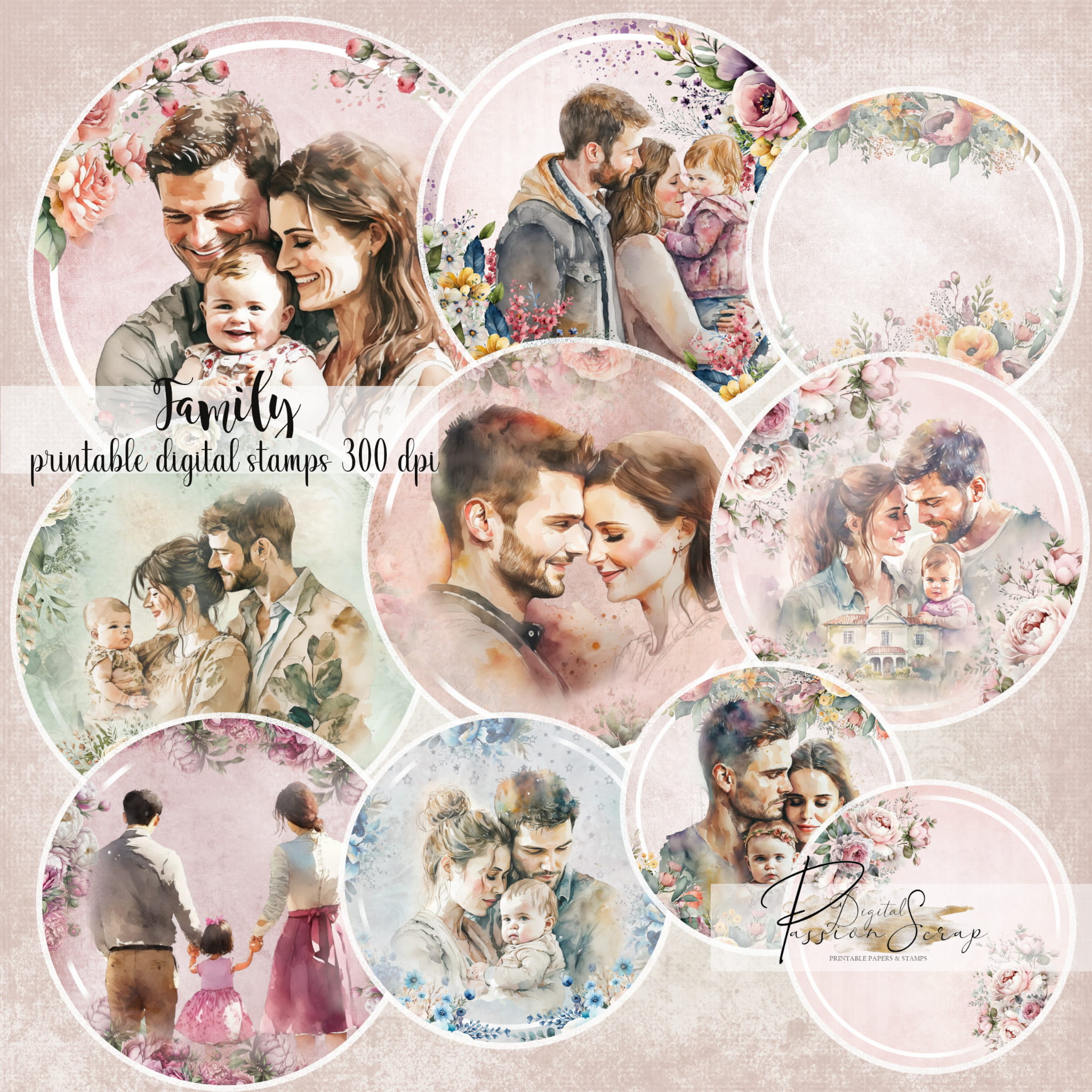 Family - 10 osobnych digi stempli PNG do samodzielnego wydruku w jakości 300 DPI