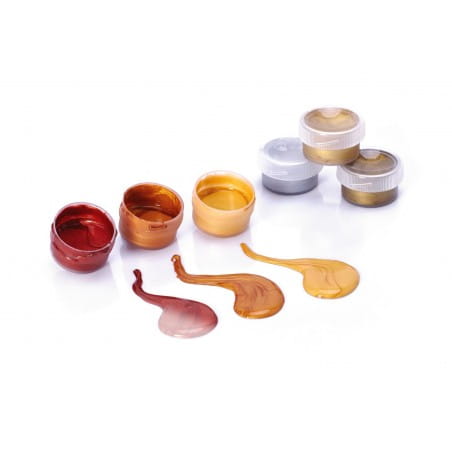 Farby dekoracyjne o połysku metalicznym są to farby wodne o kolorach do złudzenia przypominających połysk srebra, złota, mosiądzu, miedzi i brązu