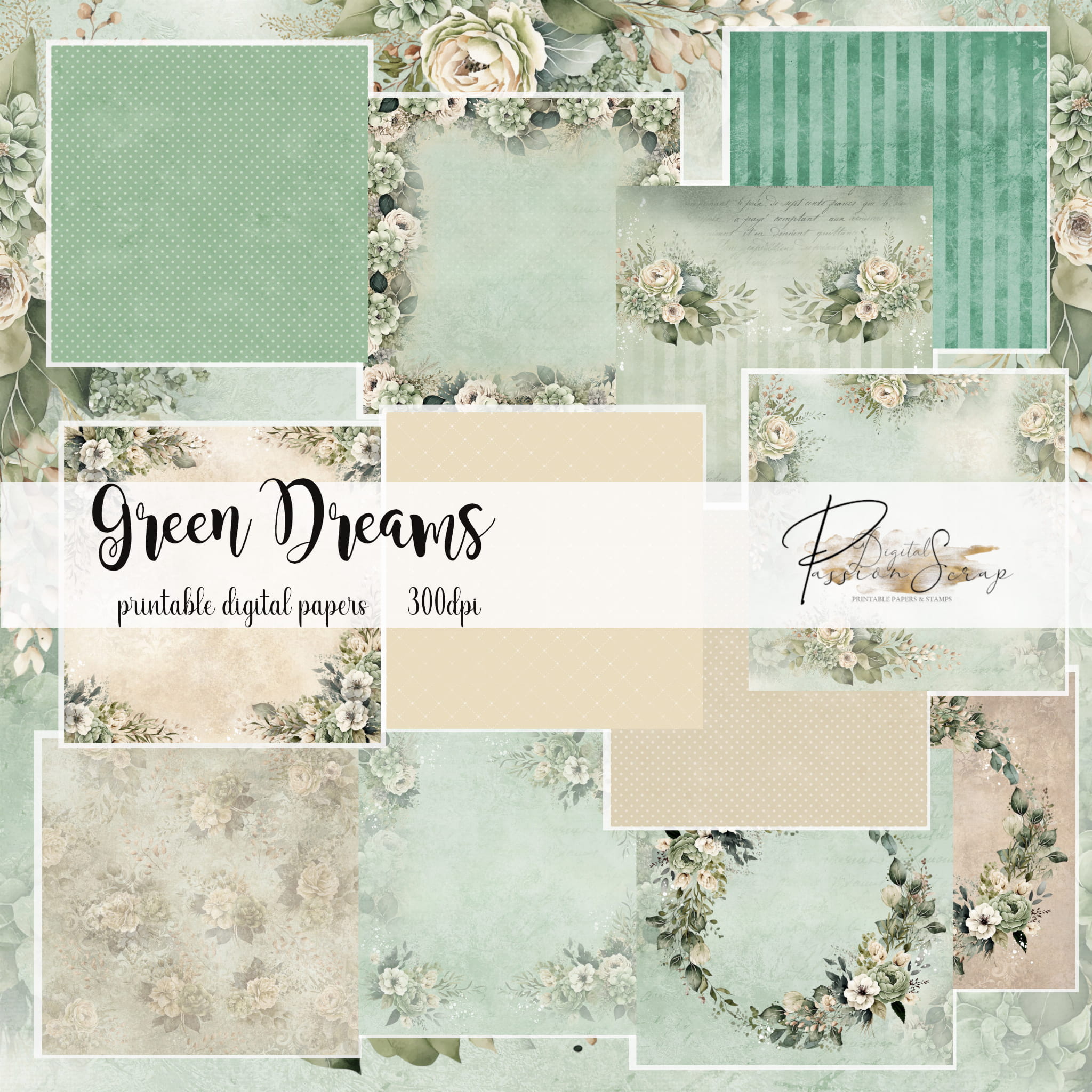 Green Dreams - 12 osobnych digi papierów PNG do samodzielnego wydruku w jakości 300 DPI
