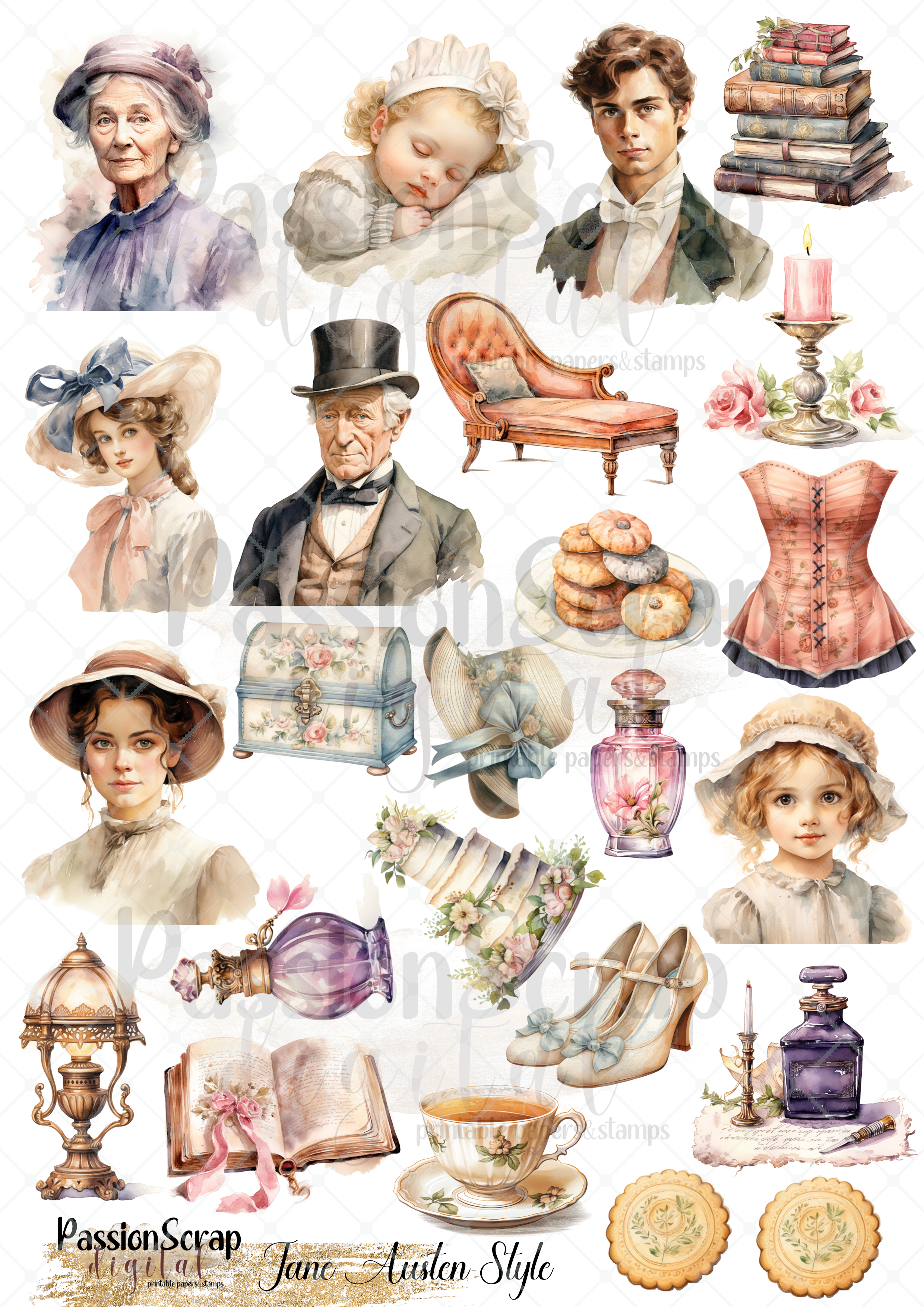 Jane Austen Style graphics - grafiki z elementami na białym tle na arkuszu A4 do samodzielnego wydruku lub stworzenia własnego oryginalnego projektu, grafiki stworzone za pomocą AI