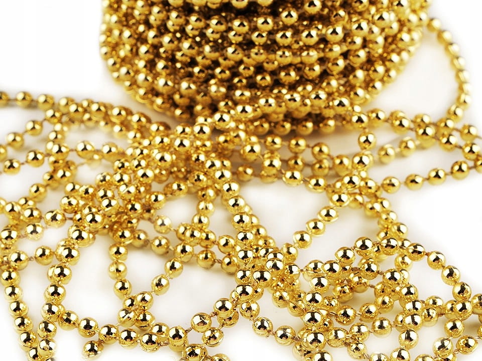 Koraliki / perełki na sznurku Ø4 mm (12m) Kolor: 3 złoty Ilość: 12 m Skład-kompozycja: poliester, plastik Średnica: 4 mm Techniki: ślubne aranżacje, florystyka, pakowanie prezentów, aranżacje na Boże Narodzenie Plastikowe perły na sznurku znajdą zastosowanie w aranżacjach ślubnych i świątecznych. Są świetne do ozdabiania bukietów kwiatowych, wieńców, krzeseł lub jako łańcuch na choinkę.