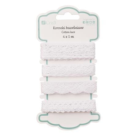 Wysokiej jakości koronki bawełniane, 4 wzory, każdy 1 metr długości. Idealne do wszelkich projektów typu home decor, pakowanie prezentów, scrapbooking, cardmaking, jako dodatek do ozdób do włosów i wielu innych. Ilość w opakowaniu: 4 wzory po 1 sztuce Kolorystyka: biały Szerokość: ok. 15mm - 20mm