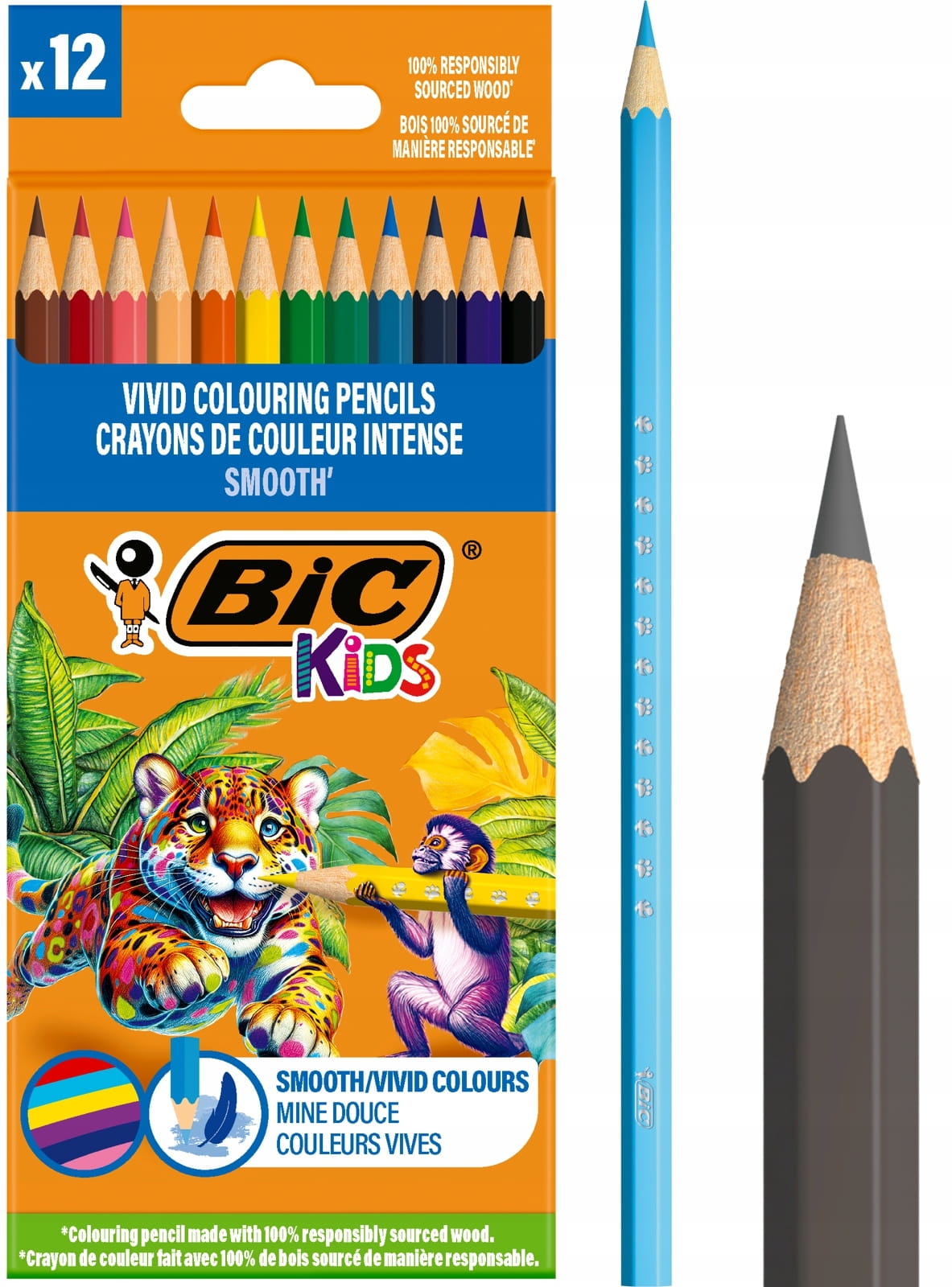 Opakowanie kredek BIC Kids w 12 różnych kolorach, zapewniających płynność rysowania i żywe kolory. Kredki te zostały wykonane w 100% z odpowiedzialnie pozyskiwanego drewna. Łatwo się je ostrzy, co oznacza wiele godzin zabawy w kolorowanie. Sześciokątny korpus ułatwia trzymanie i zapobiega staczaniu się kredki z blatu.