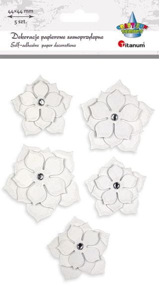 Dekoracje samoprzylepne papierowe 3D kwiaty białe z kryształkiem, 2 rozmiary: 60 x 58, 50 x 48. 5 sztuk.