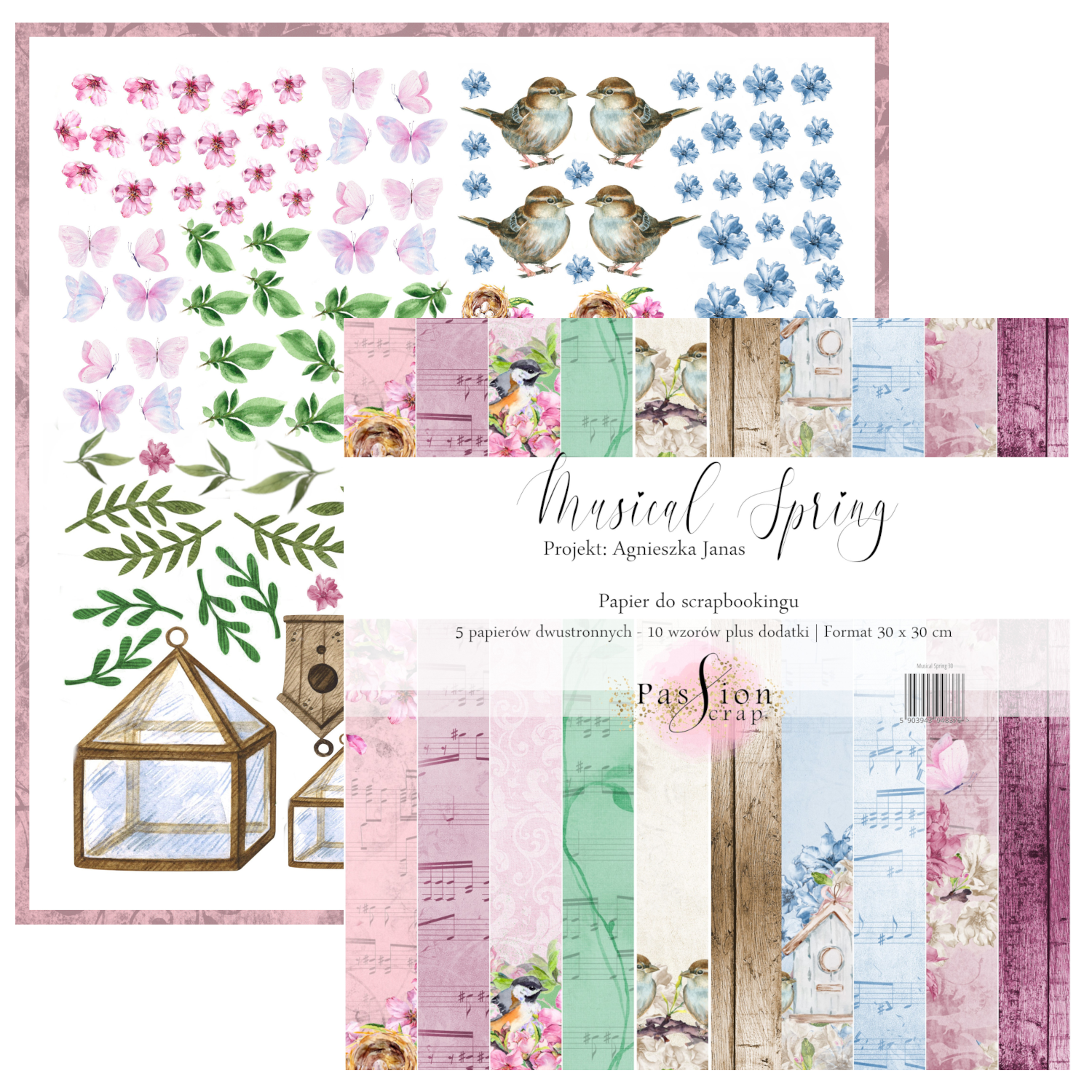 Rewers okładki arkusz papieru do scrapbookingu 30,5x31,5cm - PassionScrap - Musical Spring - elementy do wycinania. Bezkwasowe (acid-free) oraz bezdrzewne (lignin-free). Gramatura papieru - 250g. Wyprodukowane w Polsce. Wydruk w technologii offsetowej.