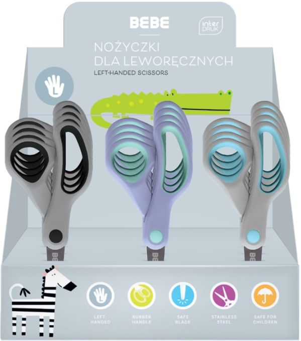 Nożyczki z ostrzem ze stali nierdzewnej z zaokrągloną końcówką. Wyprofilowane specjalnie dla osób leworęcznych. Ergonomiczny i wygodny gumowy uchwyt. Długość ostrza: 13 cm. Produkt dostępny w 3 wersjach.