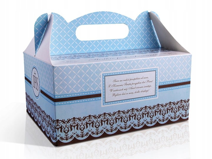 OZDOBNE PUDEŁKO NA CIASTO KOMUNIJNE NIEBIESKIE