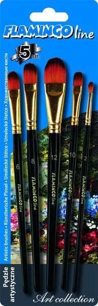 Zestaw 5 pędzli artystycznych z włosiem syntetycznym. Idealnie nadają się do bardzo precyzyjnego malowania. Gwarantują niezwykłą precyzję przydatną przy kreowaniu wszelkiego rodzaju niewielkich detali. Idealne do zastosowań szkolnych, domowych oraz dla artystów na każdym poziomie zaawansowania. Doskonale nadają się do farb olejnych, akrylowych, akwarelowych, gwaszy oraz farb do tkanin. Sprawdzą się również doskonale w technice decoupage podczas wykonywania drobnych detali. Wytrzymałe drewniane uchwyty z oznaczeniem grubości pędzla. Rodzaj końcówki: płaska zaokrąglona. NR: 2,6,8,10,12. Pakowane na blistrze po 5 sztuk