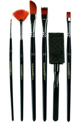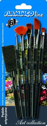 Zestaw pędzli artystycznych Art Collection 6szt. |okrągły nr 5/0|; |płaski nr 1/4|; |płaski grzebieniowy nr 3/8|; |płaski ścięty owalnie nr 3/8|; |wachlarzowy nr 2|; |gąbkowy płaski 2,5x5cm, grubość gąbki 1,2cm| syntetyczne włosie, drewniane uchwyty czarne, gąbkowy - uchwyt plastikowy czarny