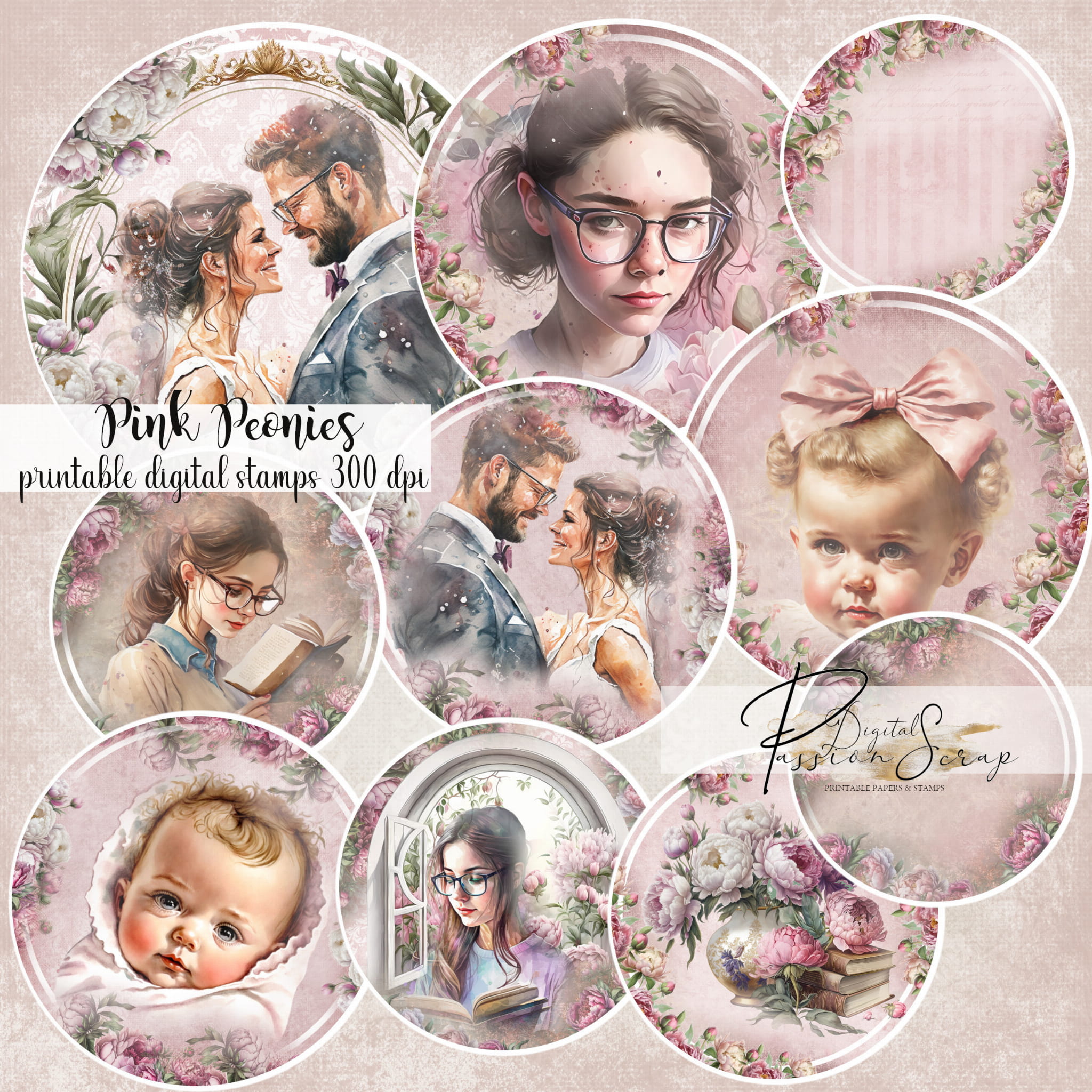 Pink Peonies - 10 osobnych digi stempli PNG do samodzielnego wydruku w jakości 300 DPI
