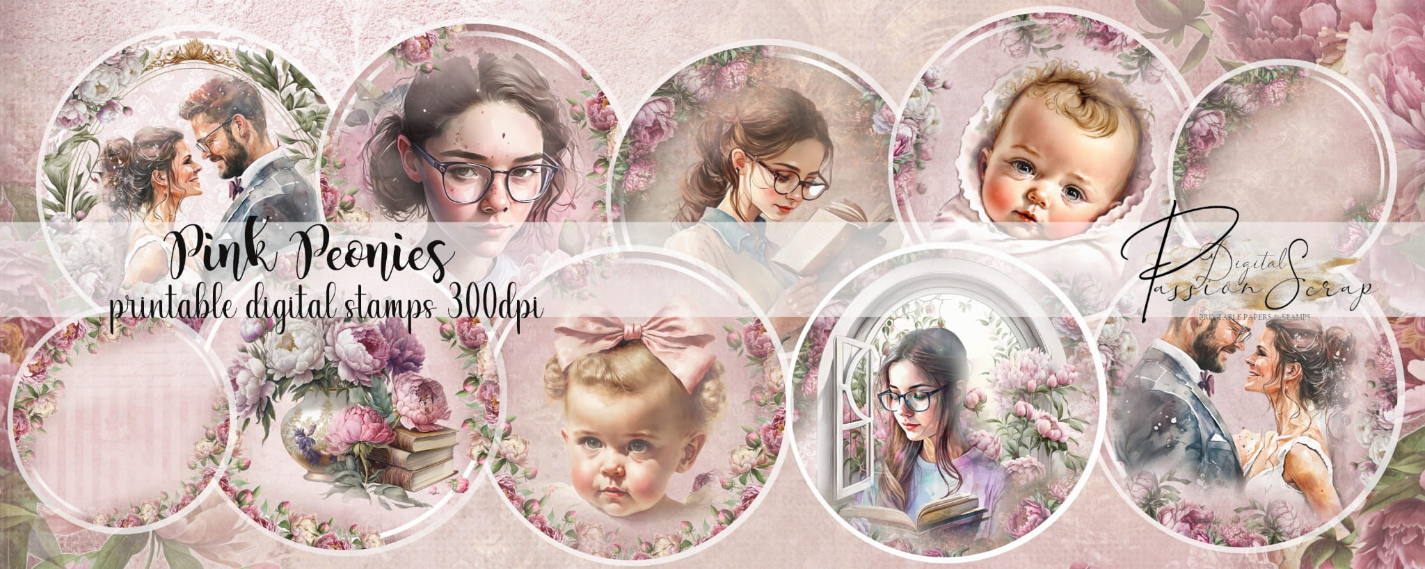 PINK PEONIES ZESTAW DIGITAL PAPERS&STAMPS