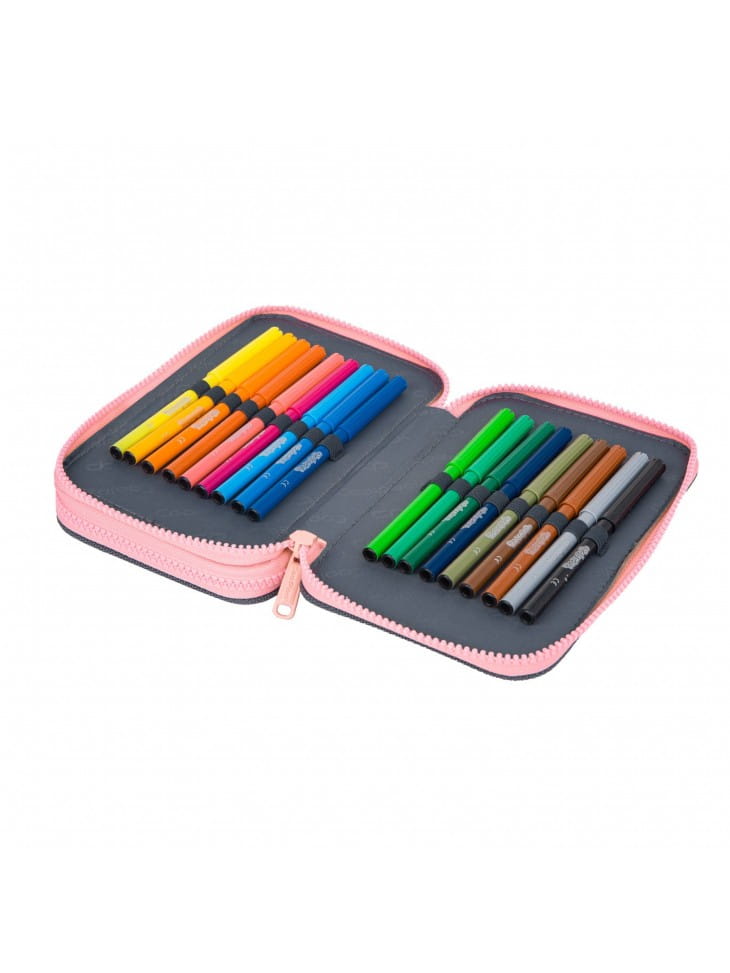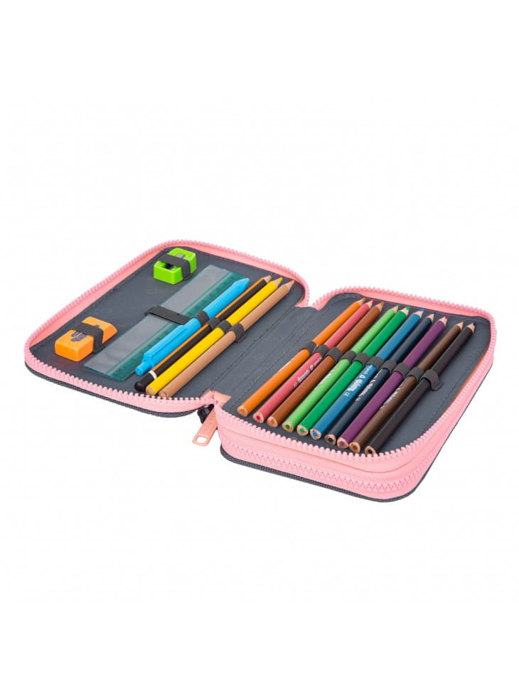 Posiada dwie pojemne komory wypełnione przyborami szkolnymi.