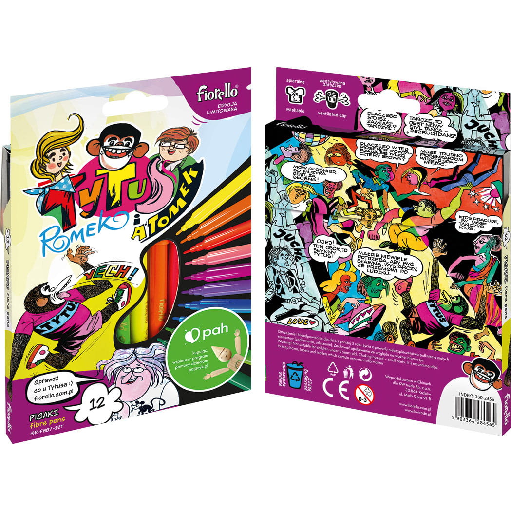 – edycja limitowana – pisaki szkolne w intensywnych kolorach – końcówka wyposażona w blokadę, nie ma mozliwości wcisnięcia jej do środka – bezpieczna wentylowana zatyczka umożliwia oddychanie w przypadku połknięcia – wyrazisty tusz na bazie wody – spieralne – zgodne z wymaganiami UE – grubość linii 1 mm – zestaw 12 kolorów