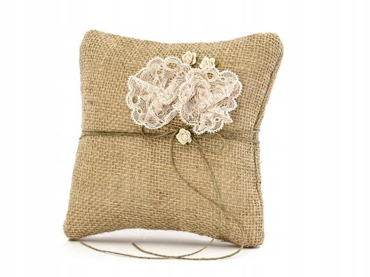 Poduszka pod obrączki z jutowej tkaniny w kolorze brązowym, z koronkowymi kwiatkami, jasnoróżowymi różyczkami i lnianym sznureczkiem, wymiary 16x16 centymetrów.
