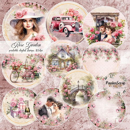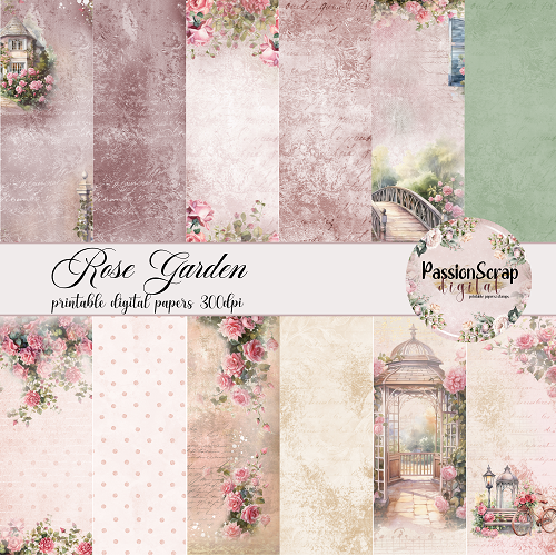 Rose Garden - 12 osobnych digi papierów PNG i 10 osobnych digi stempli PNG do samodzielnego wydruku w jakości 300 DPI