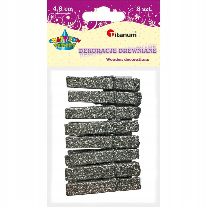 Klamerki drewniane brokatowe srebrne. Wymiar 7 x 48 mm. W opakowaniu 8 szt.
