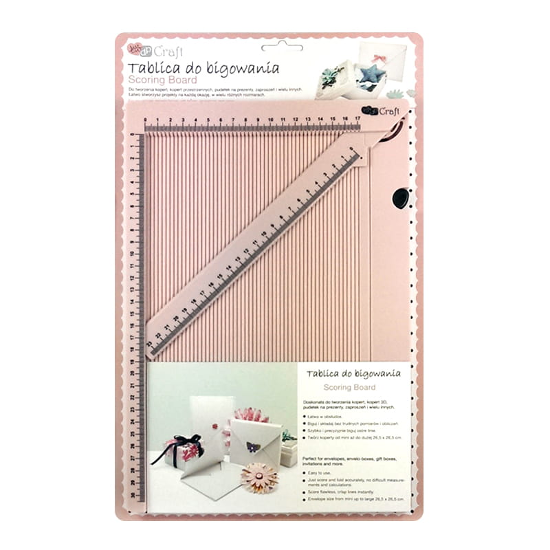 Tablica do bigowania to doskonałe narzędzie do tworzenia kopert, kopert 3D, pudełek na prezenty, zaproszeń i wielu innych projektów. - łatwa w obsłudze - biguj i składaj bez trudnych pomiarów i obliczeń - szybko i precyzyjnie biguj ostre linie - twórz koperty od mini aż do dużej 26,5 x 26,5 cm Zestaw zawiera: - tablicę do bigowania - narzędzie do bigowania - instrukcje krok po kroku do stworzenia koperty, koperty 3D, pudełka i kwiatka - rozetki - tabele pomiarowe Rozmiar: Tablica do bigowania: 23 cm x 34 cm Obszar roboczy: 18 cm x 31,5 cm