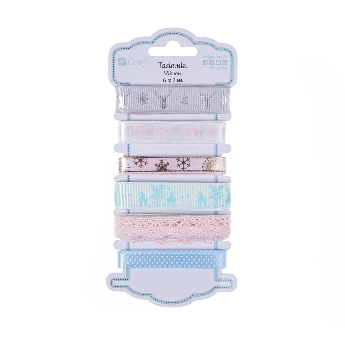 Zestaw satynowych i rypsowych tasiemek oraz koronek w pastelowych kolorach z motywami jelonków, drzewek i śniegu. Zaprojektowane jako element zimowej kolekcji Frosty Pastels. Doskonały dodatek do wszelkich projektów typu home decor, ozdób choinkowych, pakowania prezentów, kartek okolicznościowych i wielu innych prac kreatywnych. W opakowaniu: 6 x 2 m Kolorystyka: biały, pastelowy róż, miętowy, złoty, srebrny Szerokość od 10 do 20mm