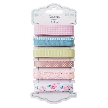 Zestaw tasiemek rypsowych, satynowych i koronek w subtelnej, pastelowej kolorystyce. Ponadczasowa kratka, kropki, przeszycia i motyw florystyczny nadają im uniwersalny charakter. Idealny dodatek do dziewczęcych i kobiecych albumów, jako dekoracja pudełek i szkatułek na damskie bibeloty. Świetne do ozdób do włosów typu opaski i spinki. W opakowaniu: 6 x 2 m Kolorystyka: pastele