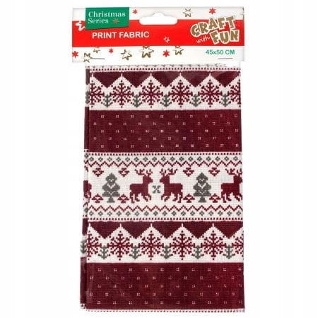 Opakowanie zawiera arkusz ozdobnej tkaniny o wymiarach 45x50cm. Przy pomocy tego zestawu możesz zaprojektować własne ozdoby świąteczne. Kolor bordowo-biały, motywy zimowe.