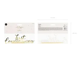 Topper na tort First Communion wykonany z papieru w kolorze złotym lustrzanym, do samodzielnego złożenia, wysokość po złożeniu ok. 21 cm.