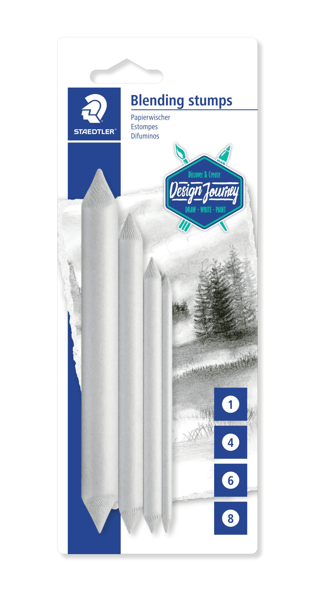 Wykonany ze ściśniętego papieru. Idealne narzędzie do cieniowania, rozcierania, mieszania. Przy pracy z kredkami pomaga łączyć kolory. Pozwala uzyskać płynne przejścia tonalne w pracach wykonanych węglem, kredą, pastelą. W opakowaniu 4 sztuki, wielkości: 1, 4, 6, 8.