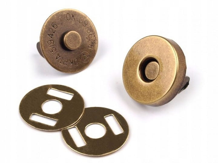 Zapięcie magnetyczne używane jest jako zapięcie torebek, koszyków do szycia, portfel klap torebek, w scrapbookingu zapięcie albumów lub notesów. Jeden zestaw składa się z 4 części - 2 zapięć i 2 podkładek. Instrukcja obsługi: 1) Zgodnie z rozstawem nóżek należy wyznaczyć nacięcia i przeciąć materiał. 2) Nóżki magnesu przełożyć tak, aby przeszły przez materiał i wyszły na wewnętrznej stronie. 3) Na nóżki należy nałożyć metalową nakładkę, ścisnąć do siebie i odgiąć nóżki na boki. 4) Drugą część założyć w ten sam sposób. Średnica: 14 mm Całkowita grubość: 4 mm W opakowaniu 10 zestawów. Produkt nie nadaje się dla dzieci poniżej 3 lat - niebezpieczeństwo połknięcia