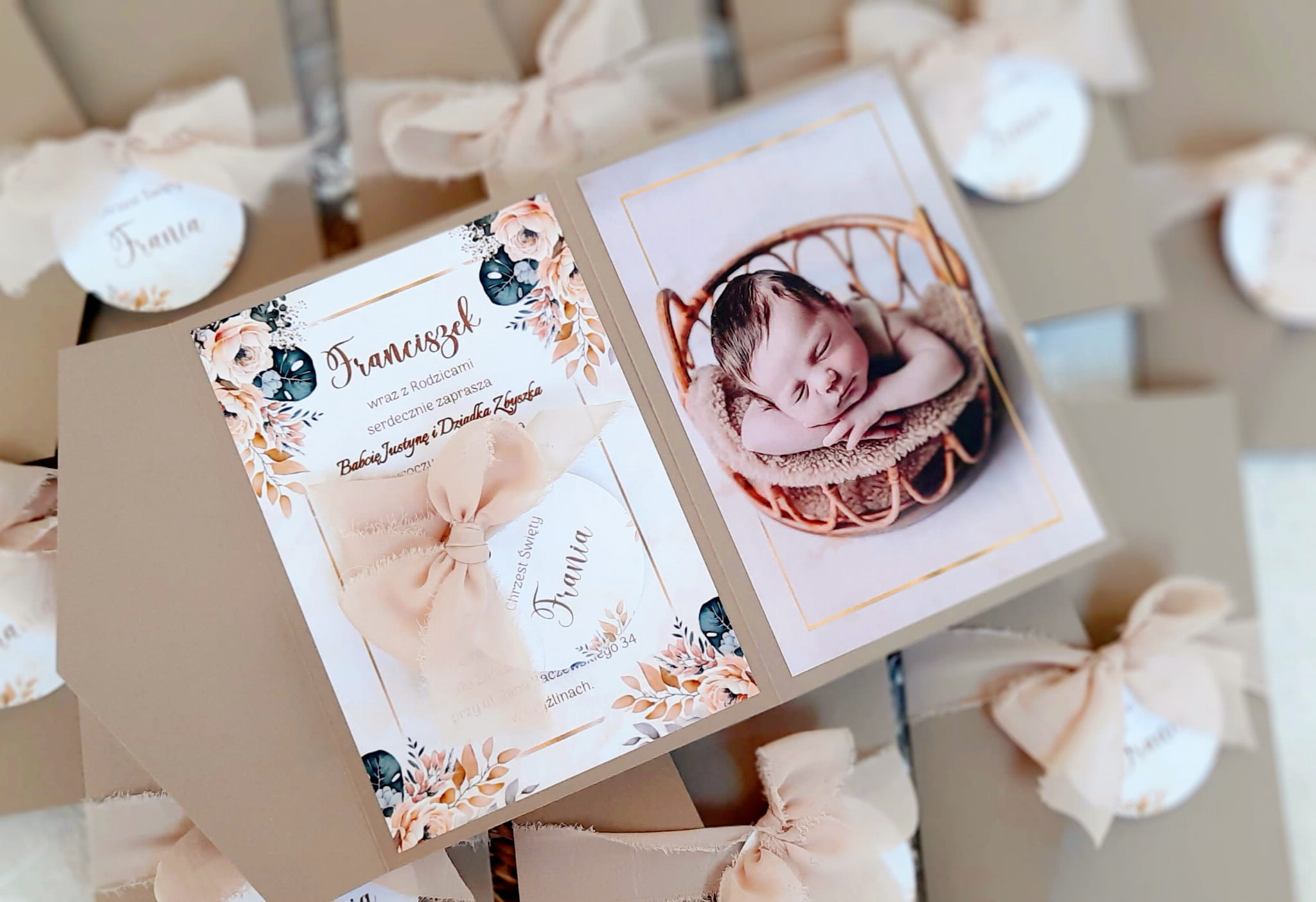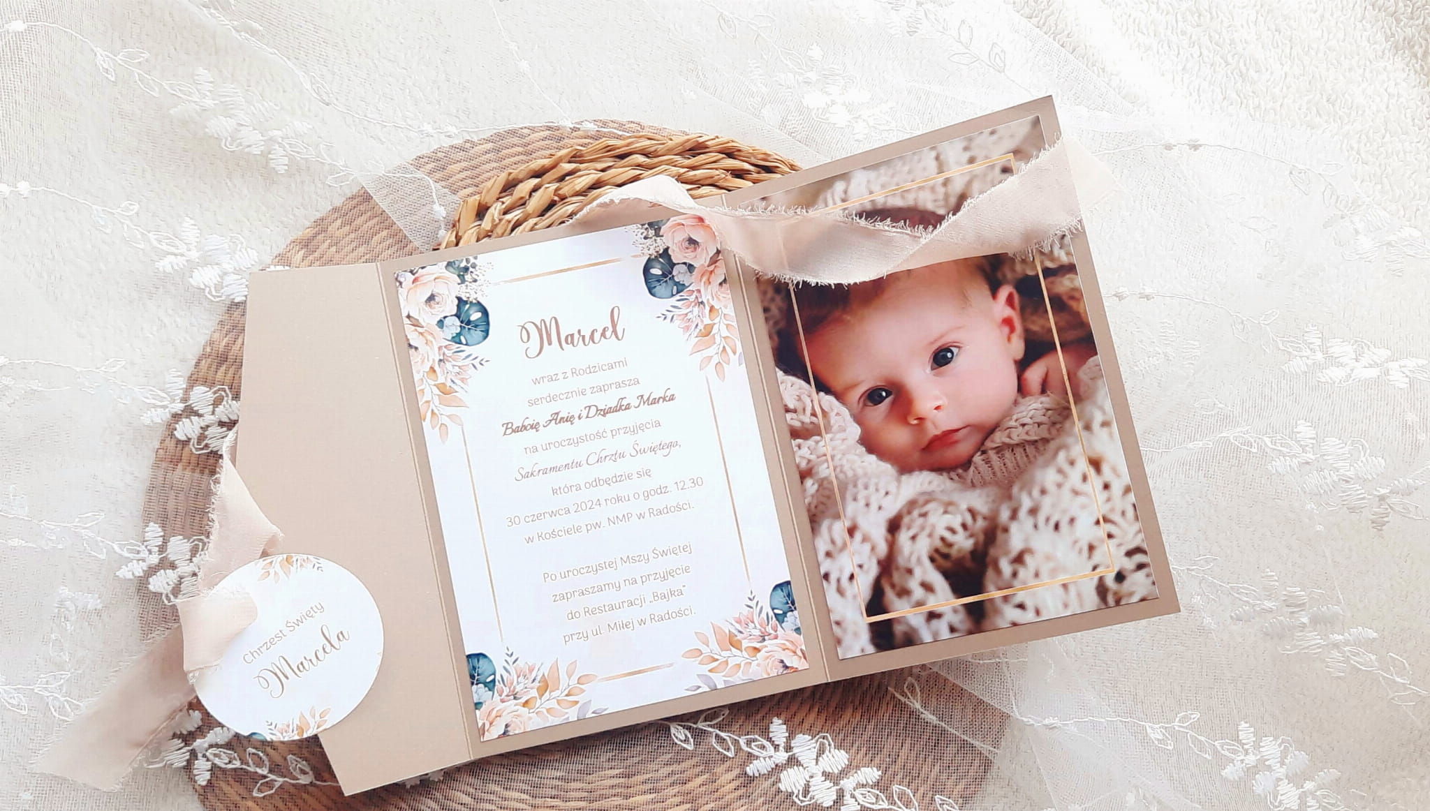 Zaproszenia na chrzest w formie folderu (koperty) ze zdjęciem dziecka (możliwość zmiany zdjęcia na motyw graficzny)