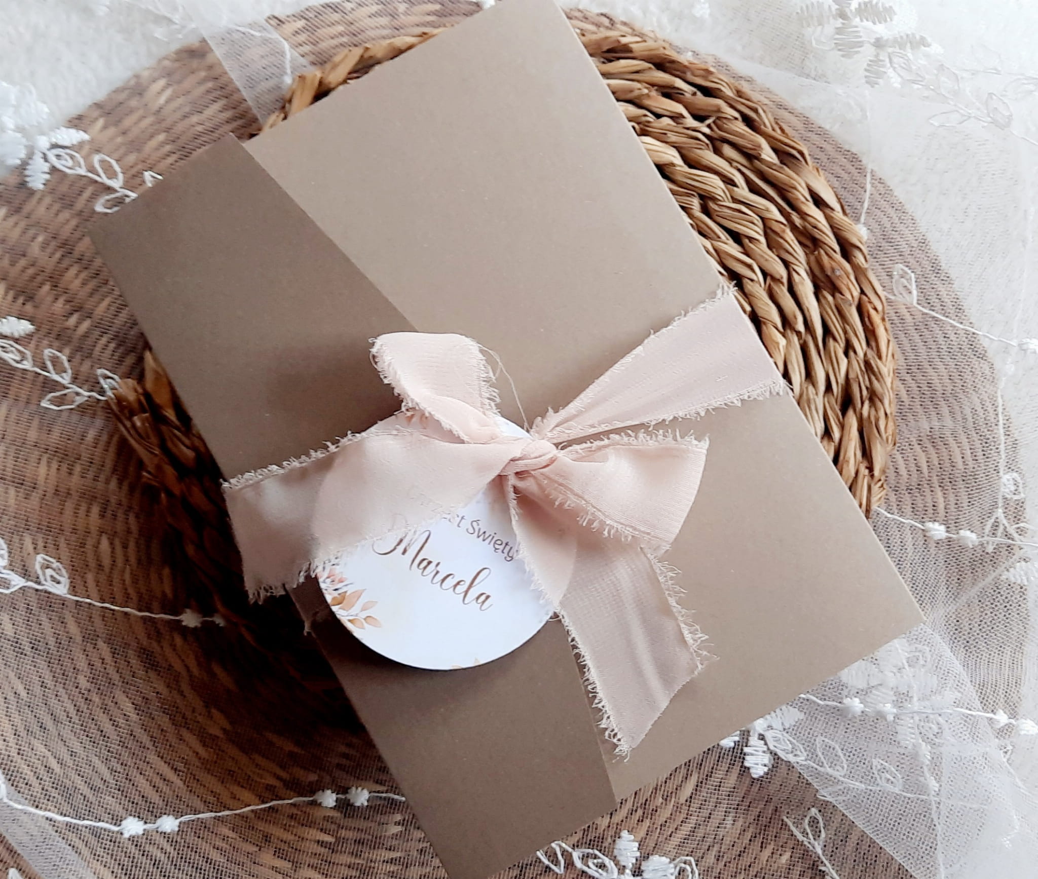 Zaproszenia wykonane z barwionego papieru ekologicznego w kolorze beżowym,