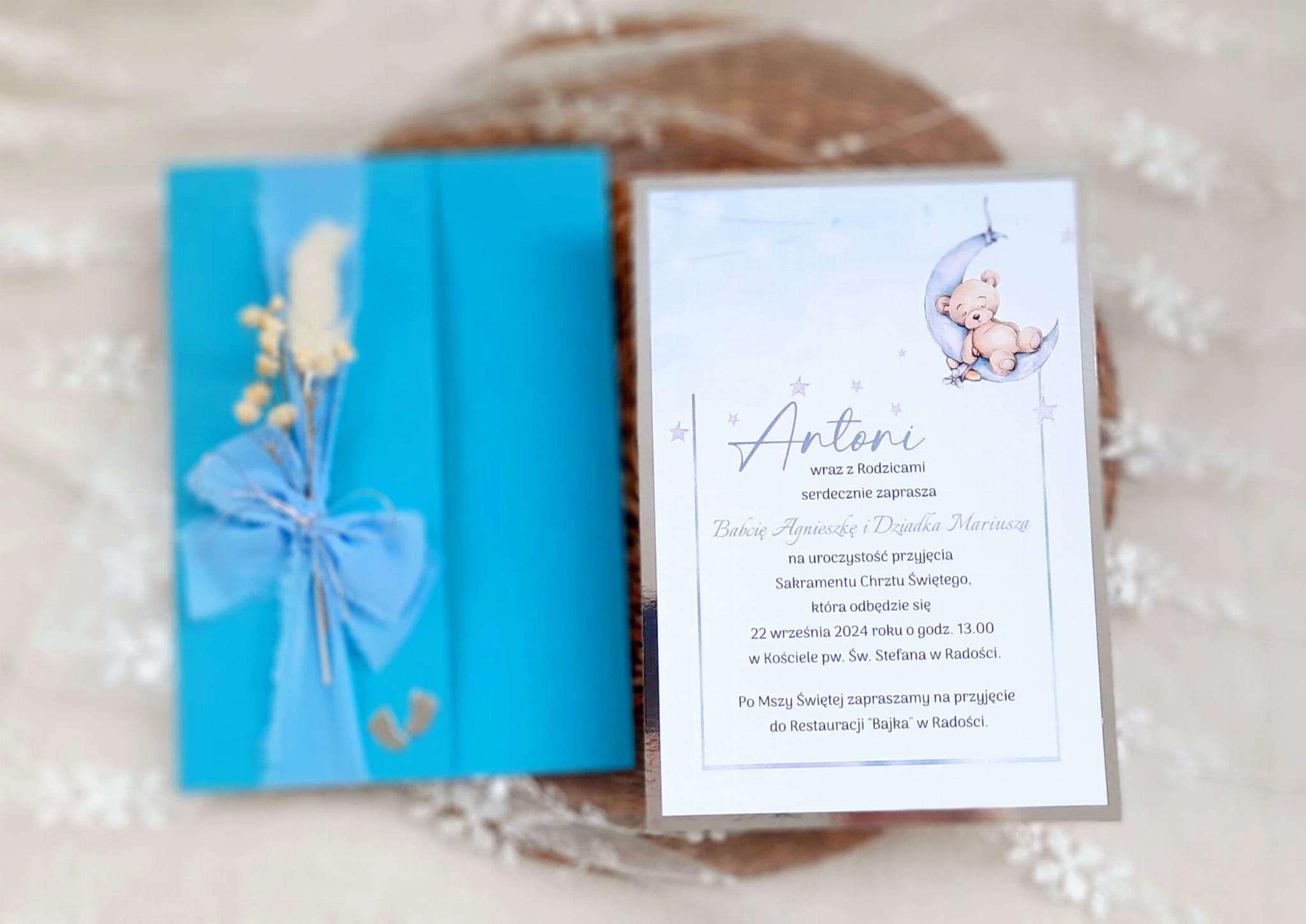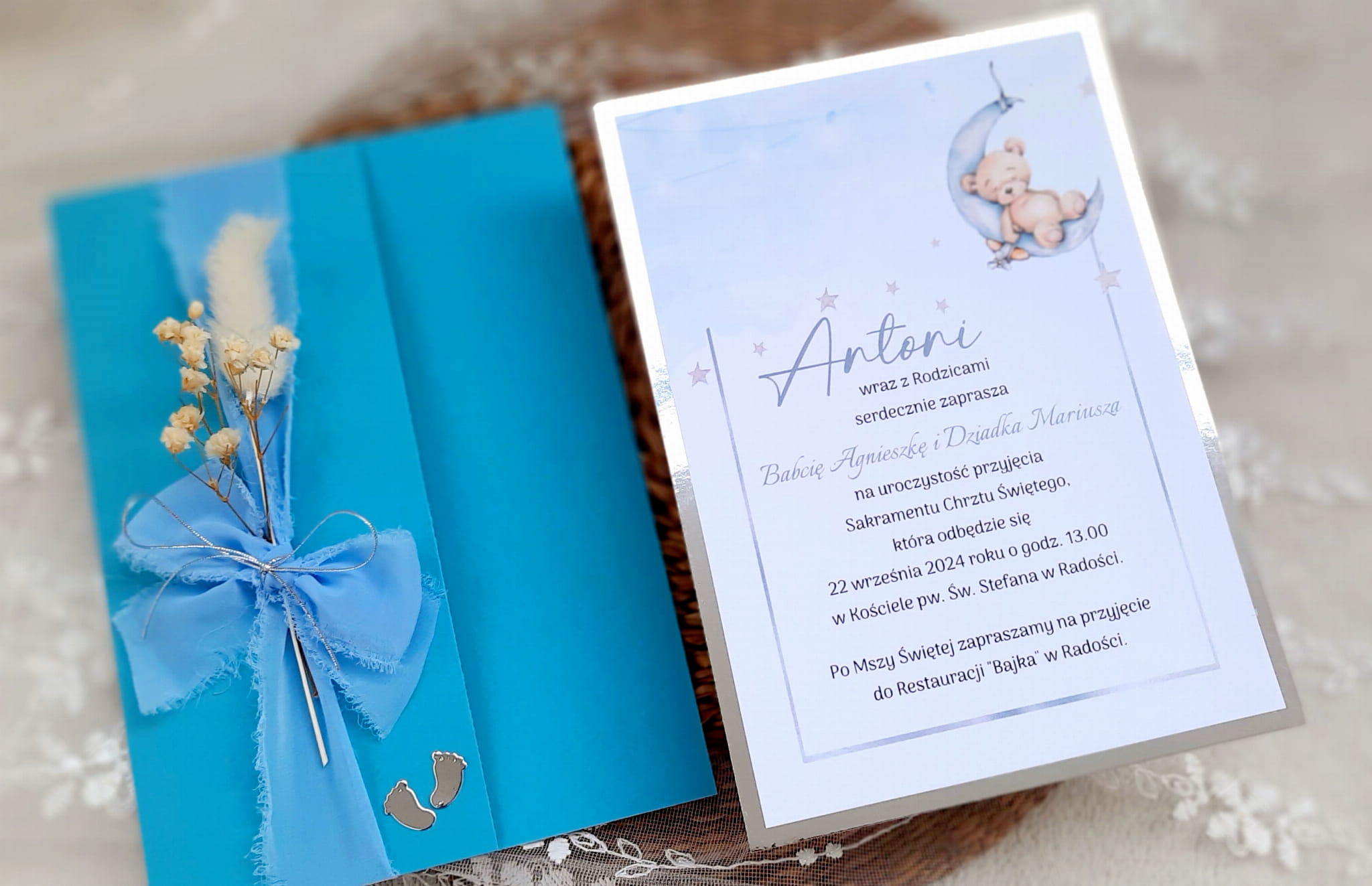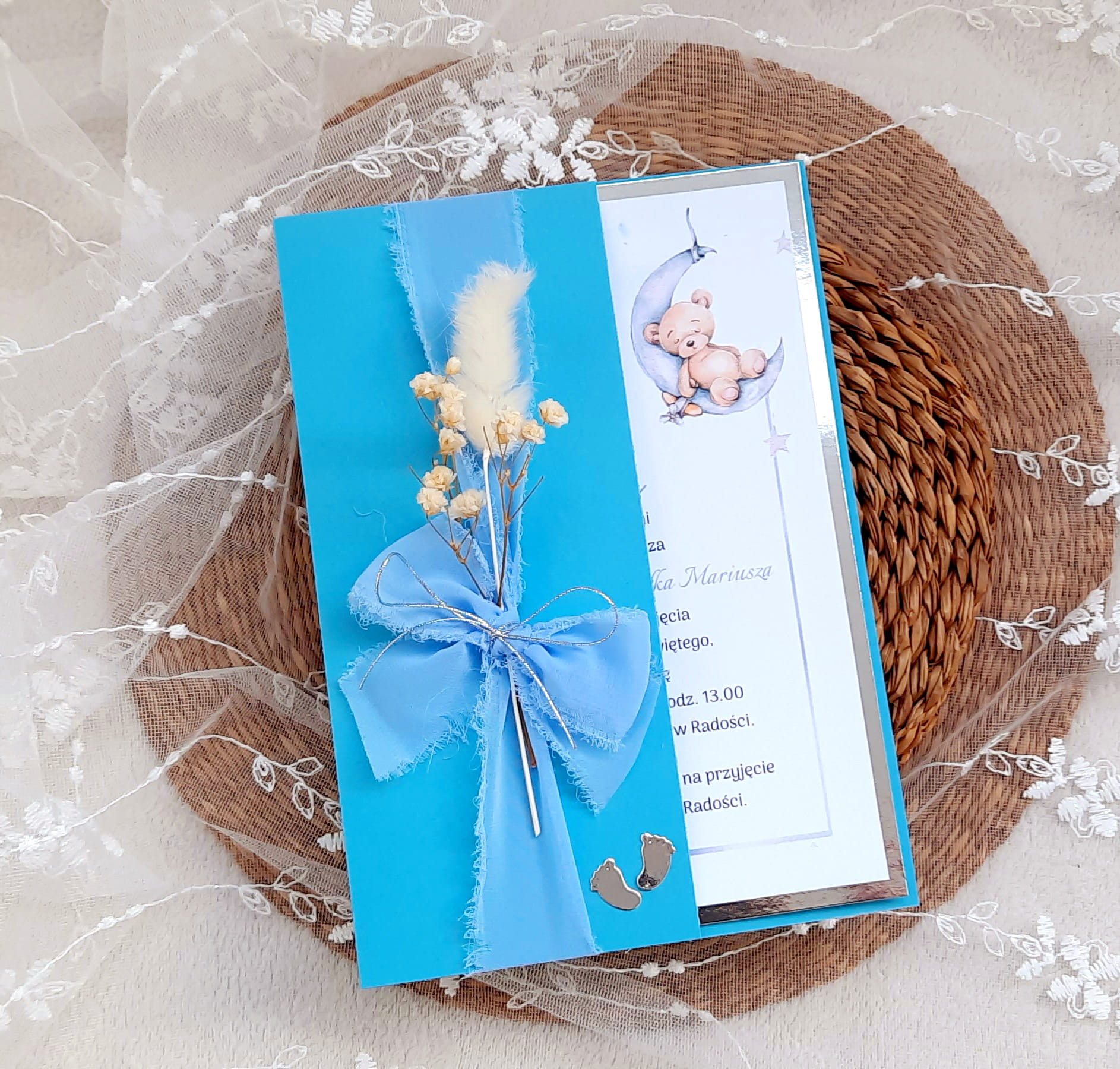 Jednokartkowe zaproszenia na chrzest z motywem misia na podkładzie z papieru lustrzanego,