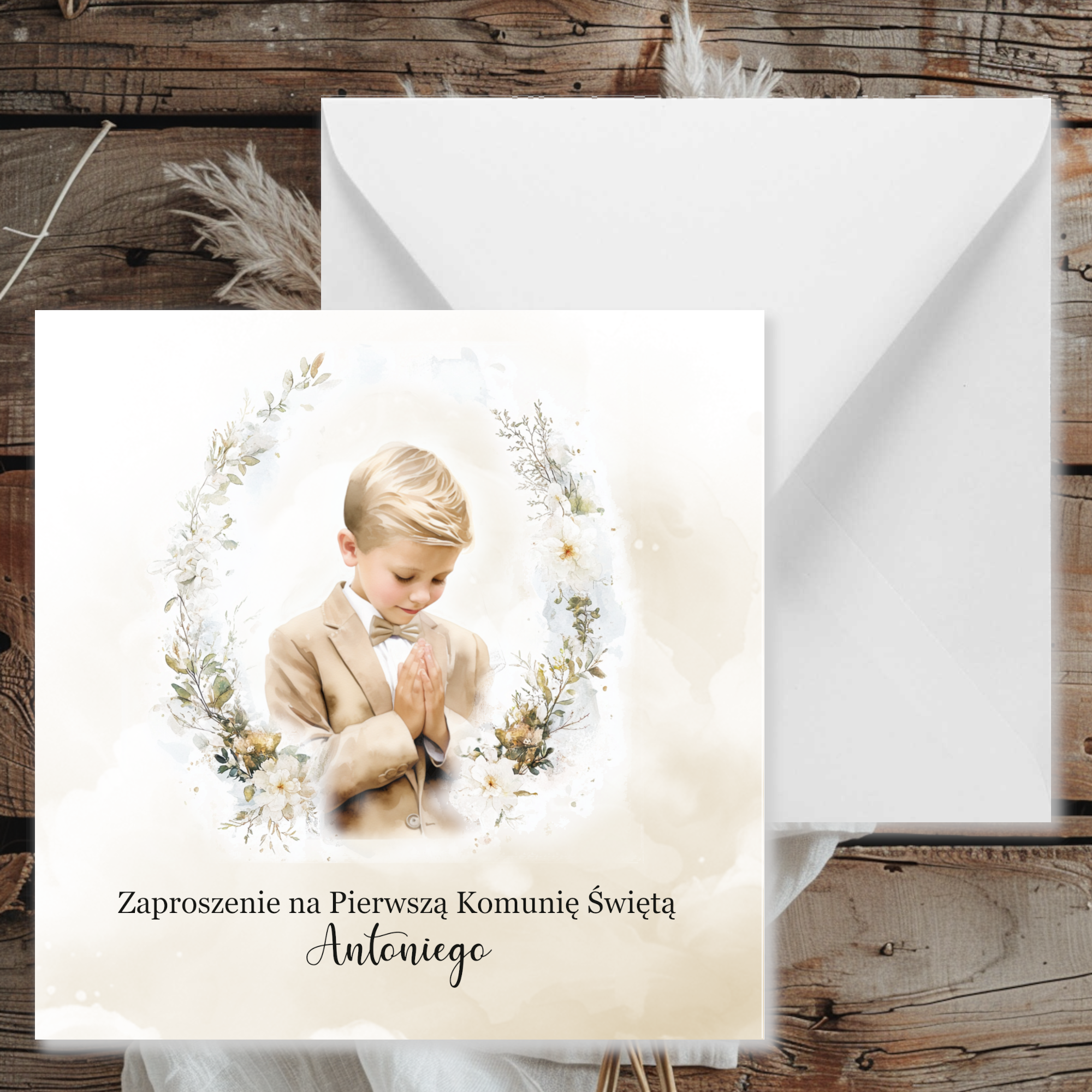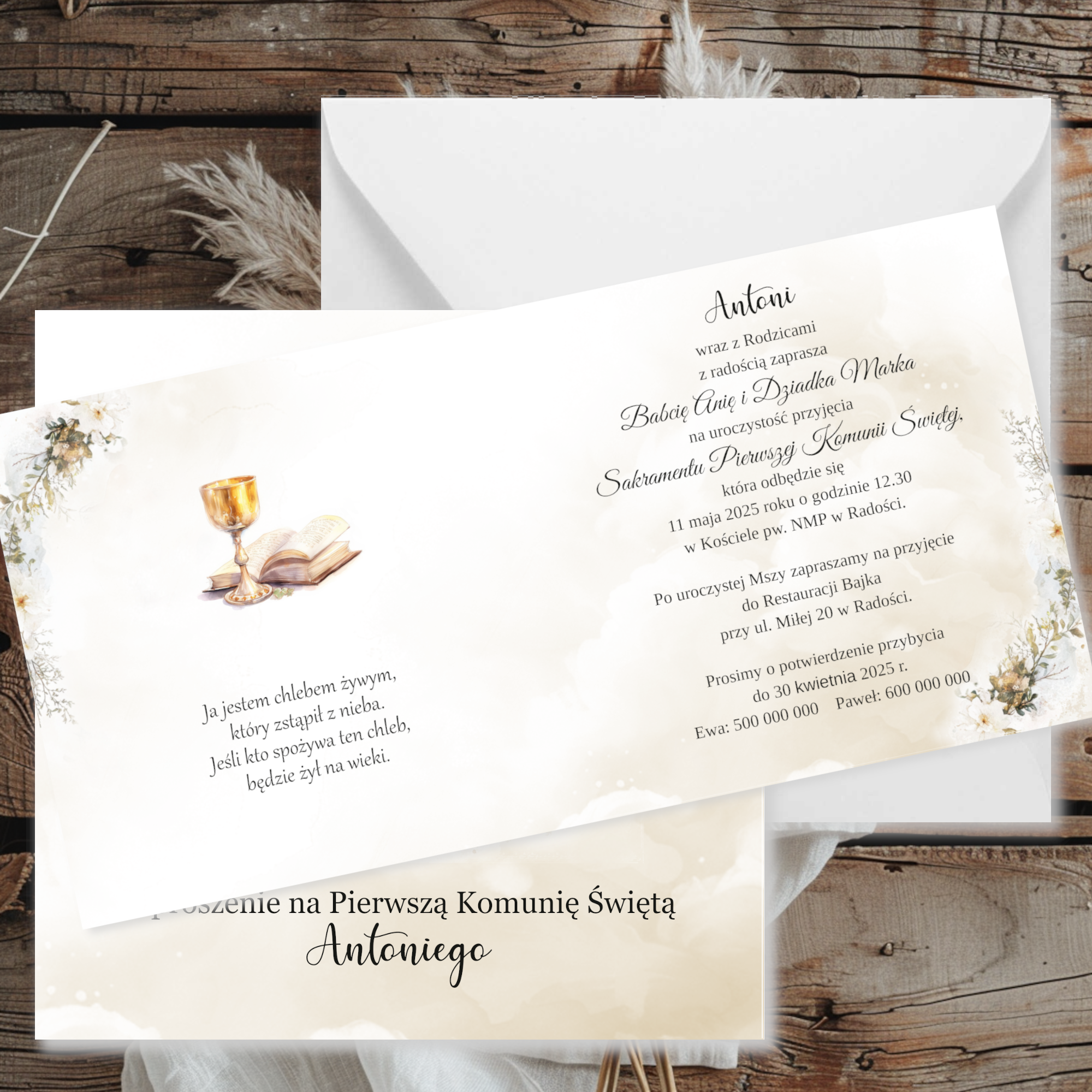Zaproszenia na komunię w uniwersalnej kolorystyce z piękną grafiką.