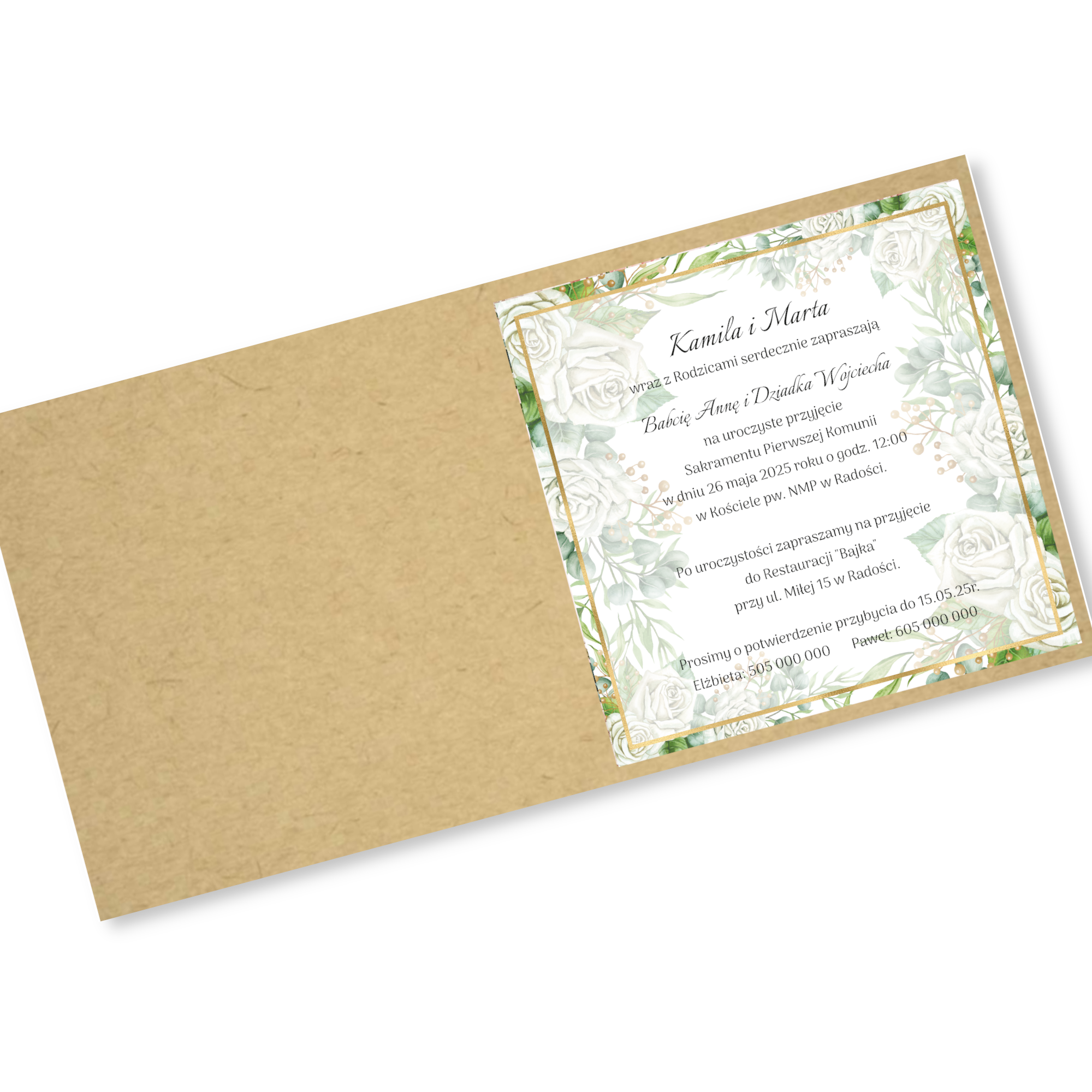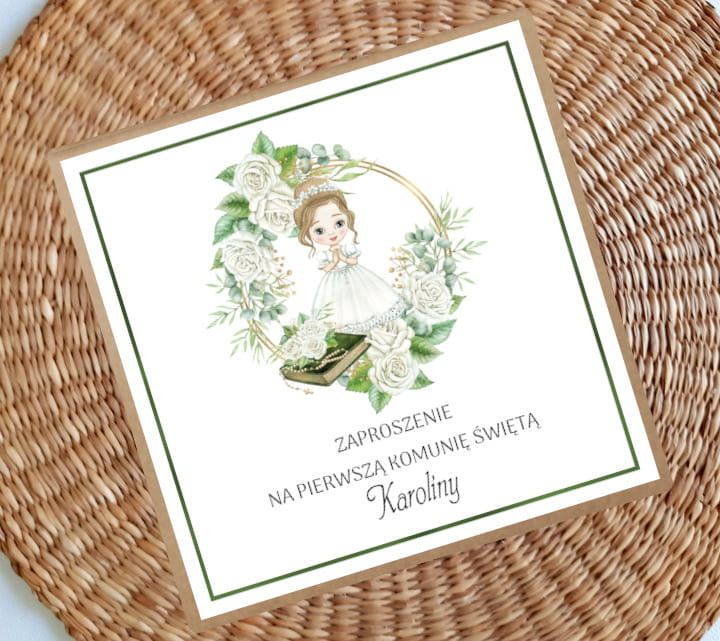 Zaproszenia na komunię w uniwersalnej kolorystyce z grafiką oraz papierem kraftowym