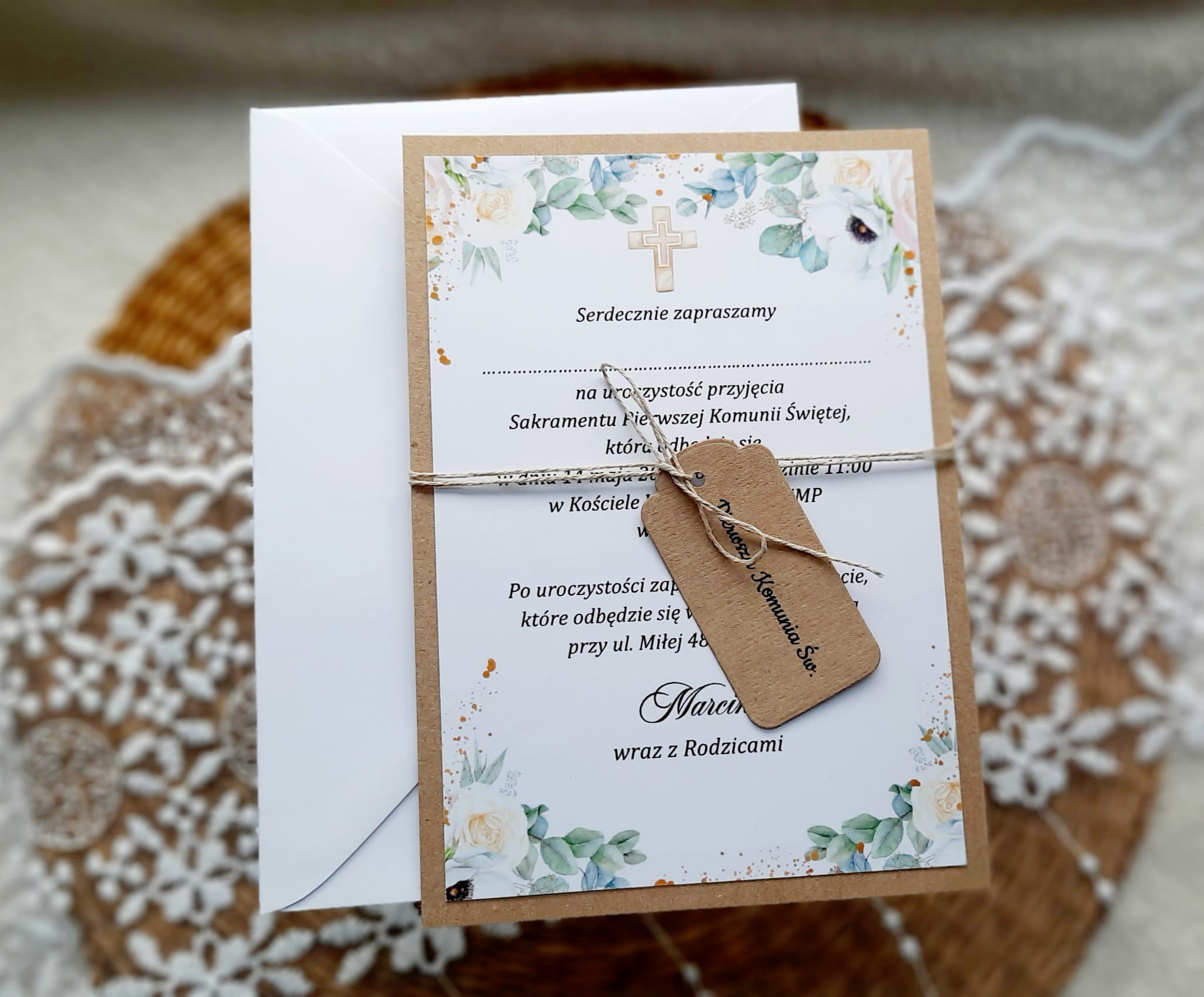 Jednokartkowe zaproszenia na komunię w uniwersalnej kolorystyce z grafiką oraz papierem kraftowym