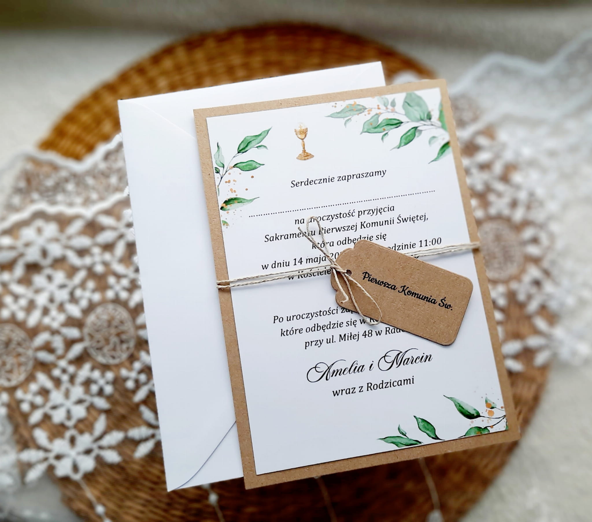 Jednokartkowe zaproszenia na komunię w uniwersalnej kolorystyce z grafiką oraz papierem kraftowym
