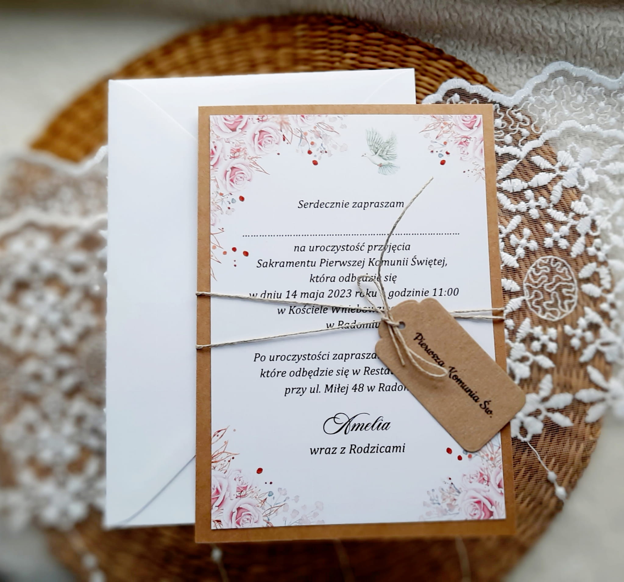 Jednokartkowe zaproszenia na komunię w uniwersalnej kolorystyce z grafiką oraz papierem kraftowym