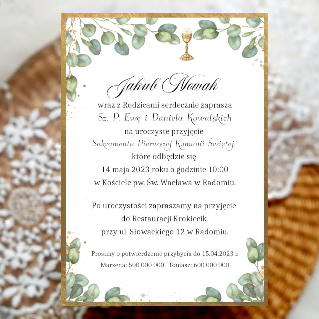 Jednokartkowe zaproszenia na komunię w uniwersalnej kolorystyce z grafiką oraz papierem lustrzanym