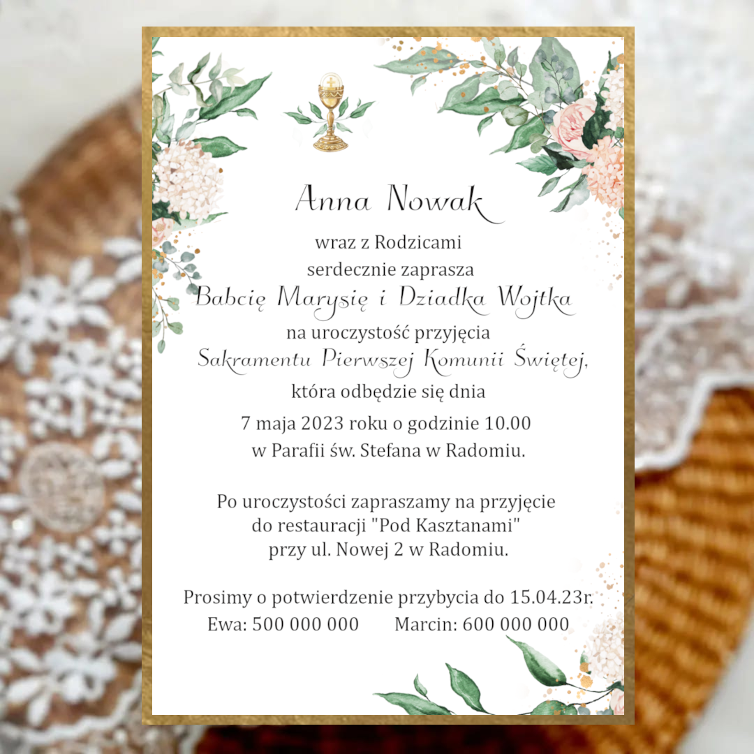 Jednokartkowe zaproszenia na komunię w uniwersalnej kolorystyce z grafiką oraz papierem lustrzanym