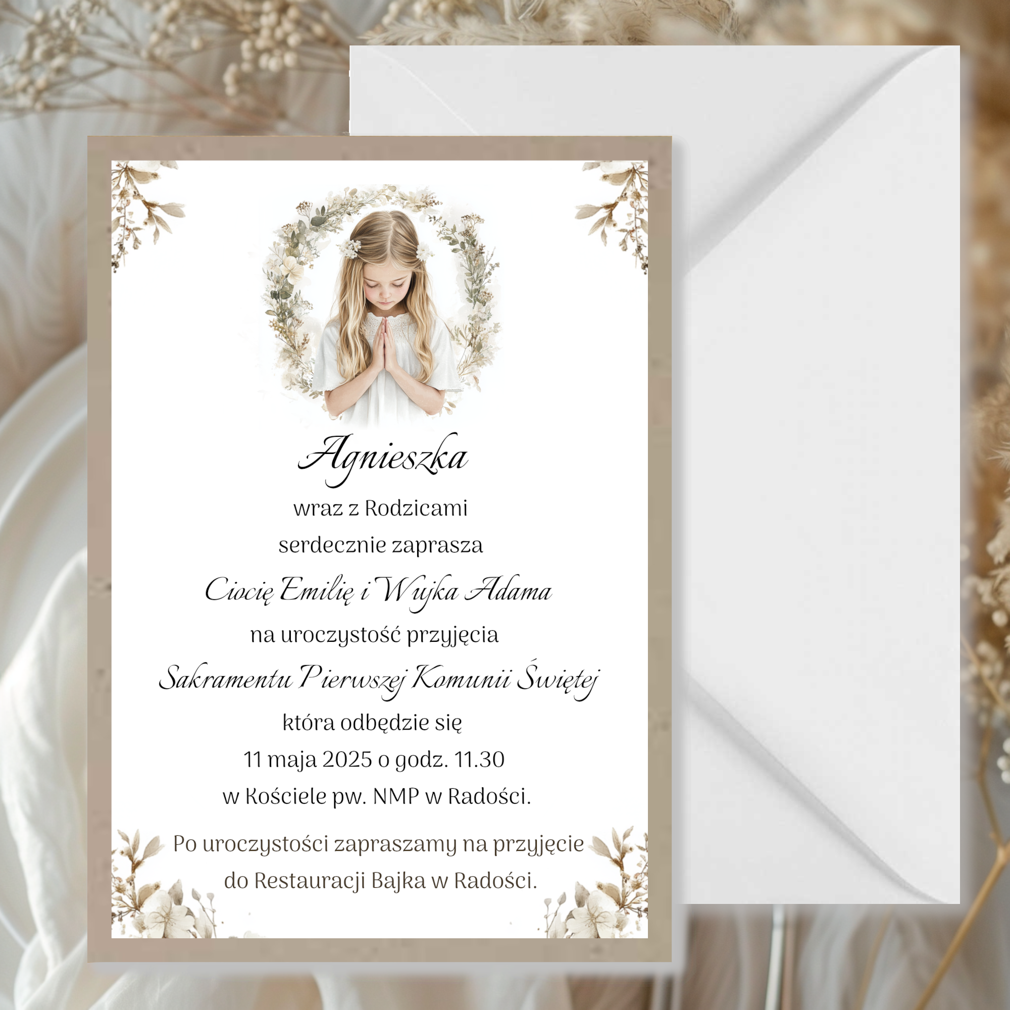 Jednokartkowe zaproszenia na komunię w uniwersalnej kolorystyce z grafiką oraz papierem ekologicznym