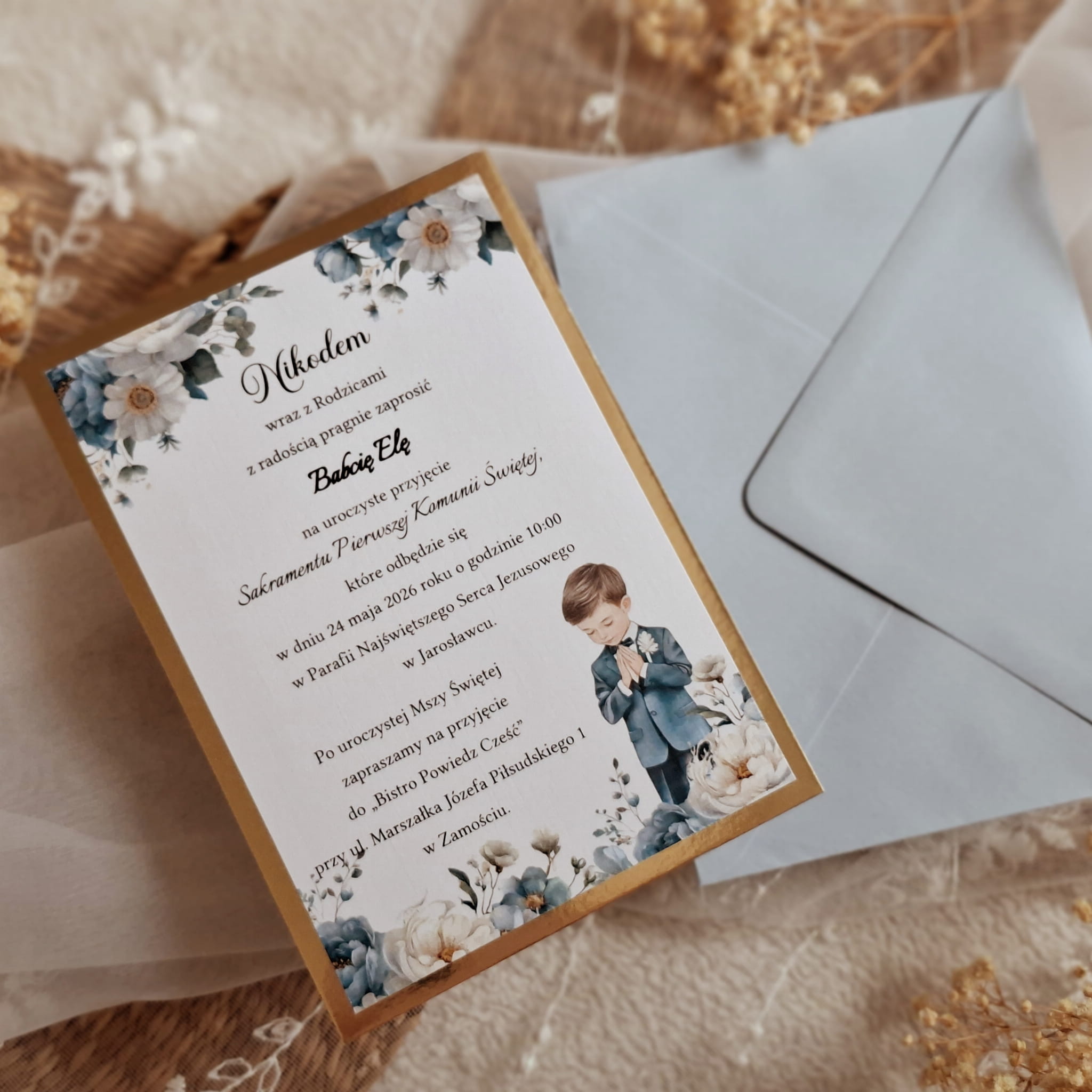 Jednokartkowe zaproszenia na komunię w uniwersalnej kolorystyce z grafiką oraz papierem lustrzanym
