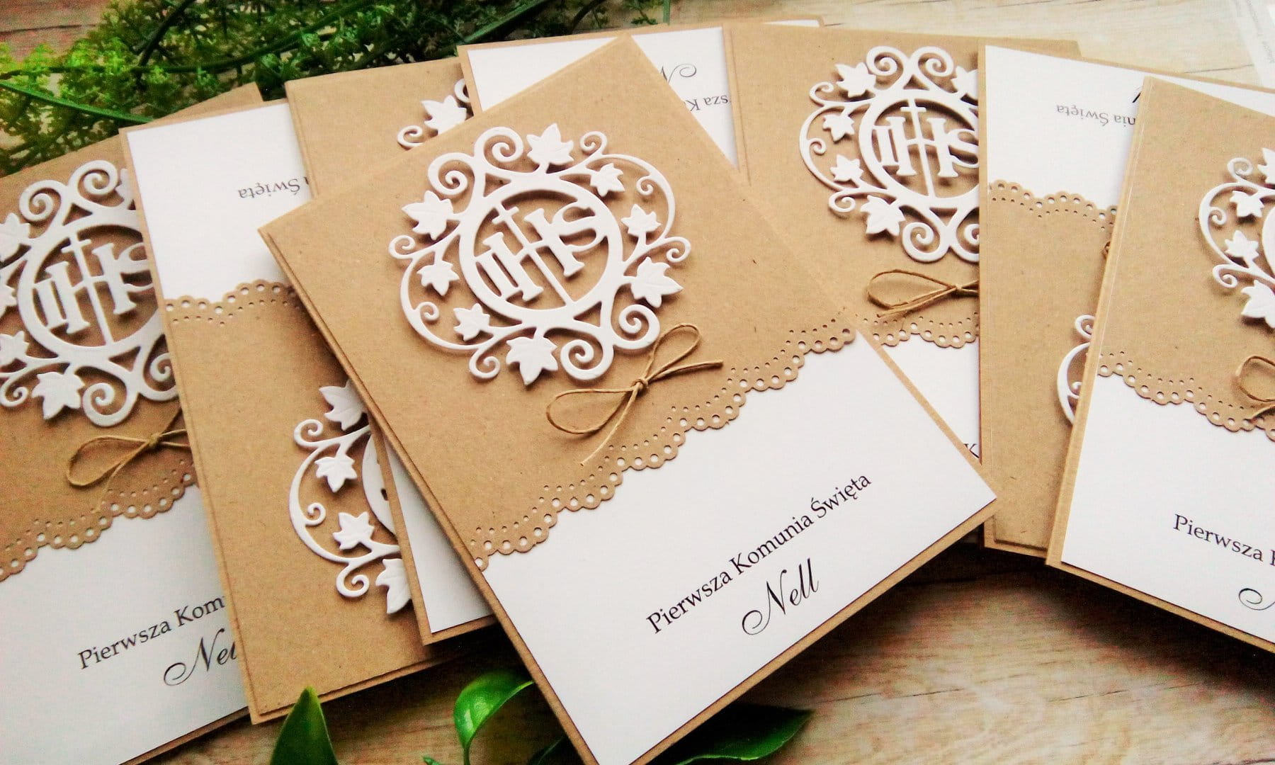 Zaproszenia na komunię z papierem kraftowym i napisem IHS