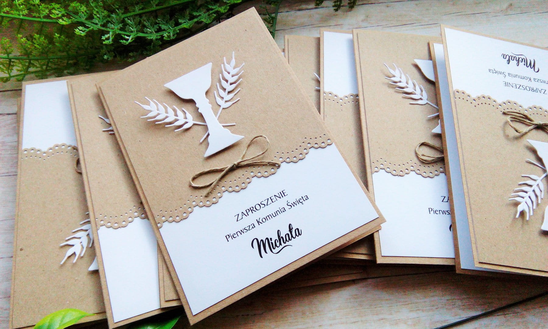 Zaproszenia na komunię z papierem kraftowym i napisem kielichem