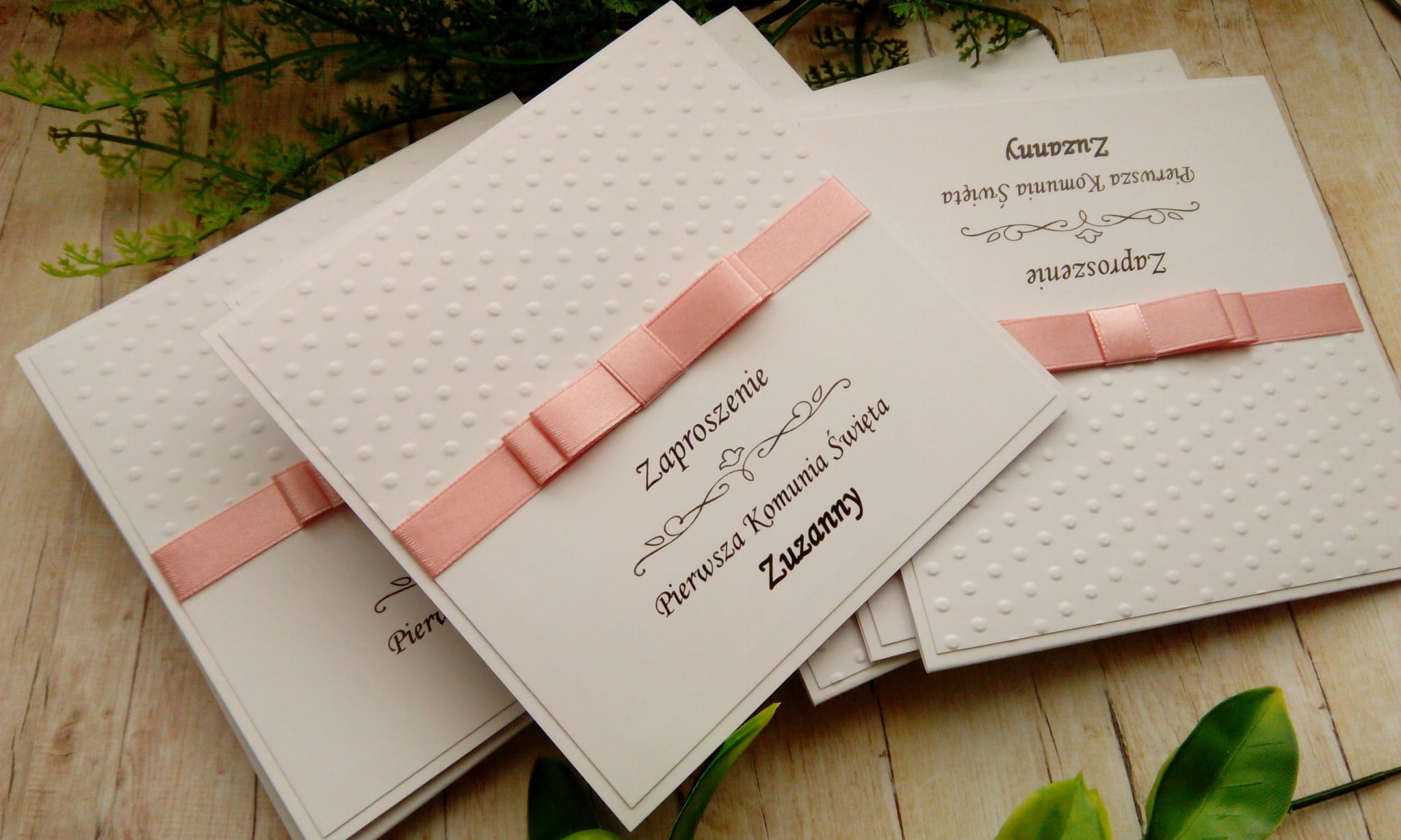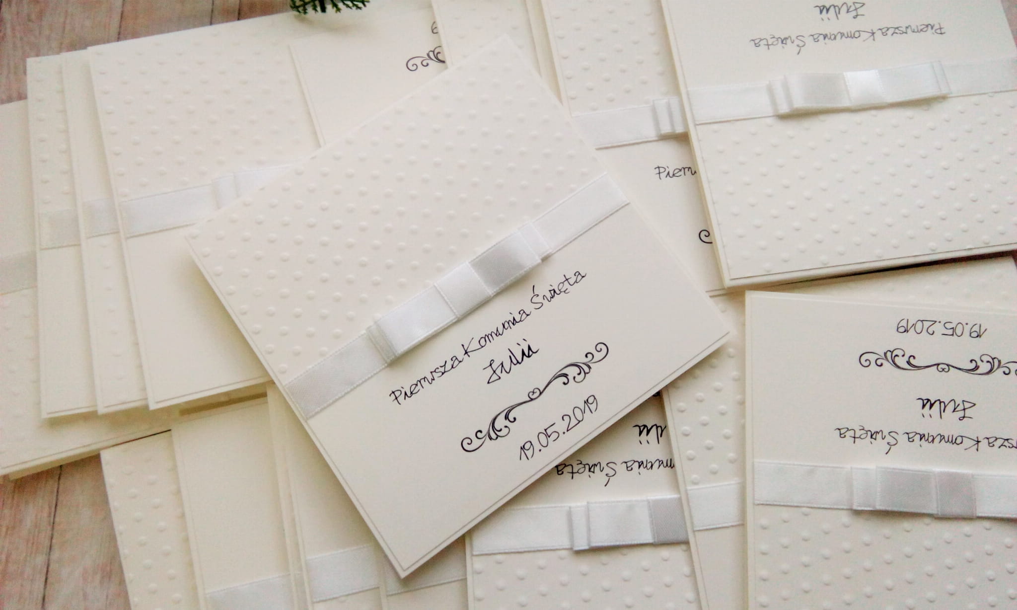 Zaproszenia na komunię z tłoczeniem w formie kropeczek i kokardką - możliwość zmiany kolorystyki.