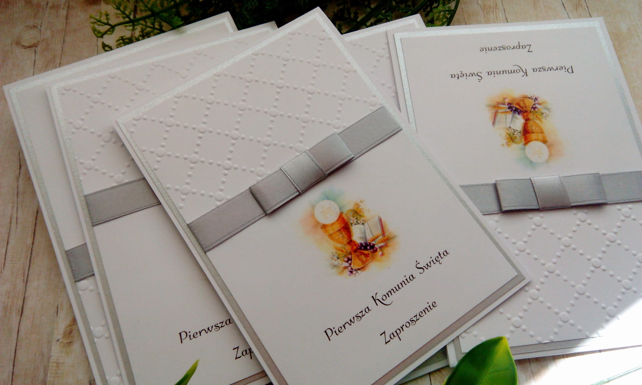 Zaproszenia na komunię z grafiką kielicha, tłoczeniem i kokardką - możliwość zmiany kolorystyki.