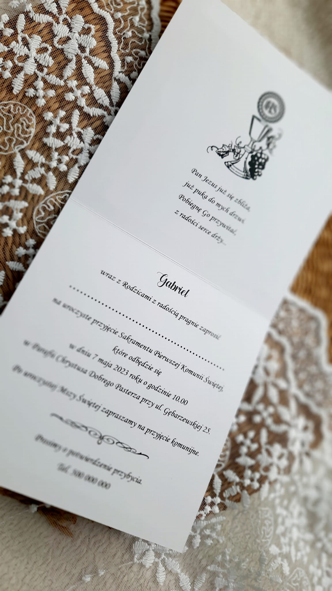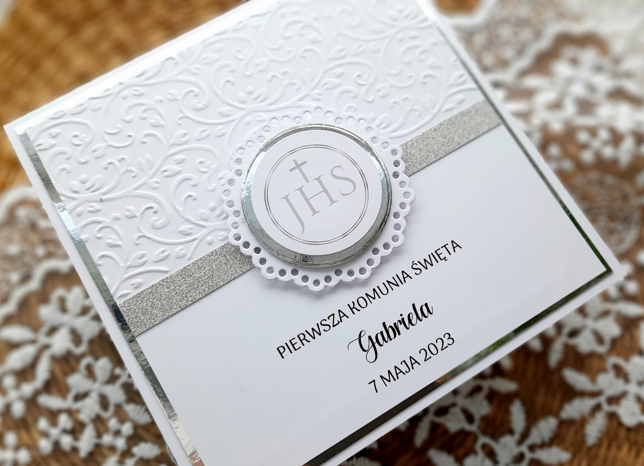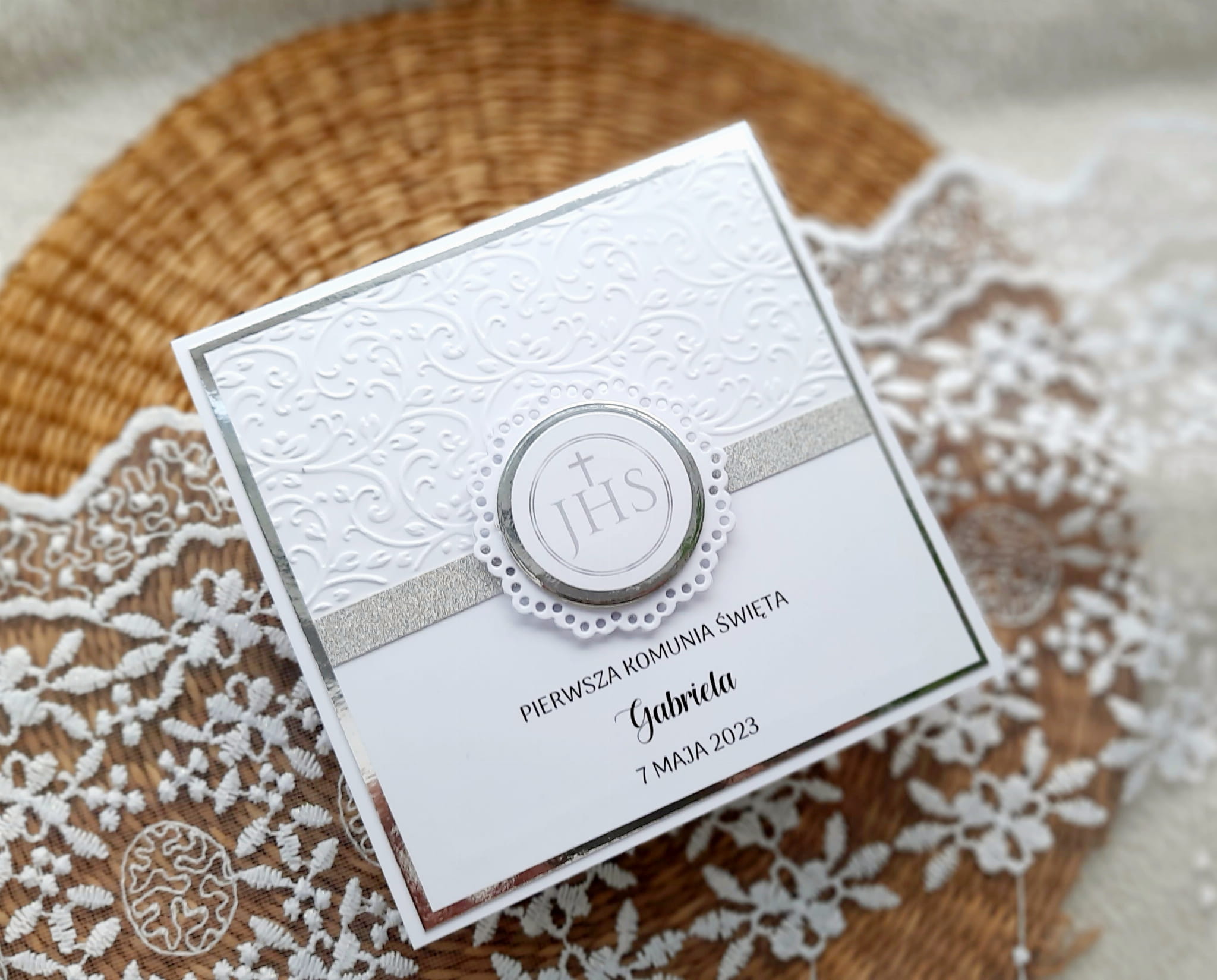 Eleganckie zaproszenia na komunię z tłoczeniem, napisem IHS, z papierem brokatowym i lustrzanym w kolorze srebrnym
