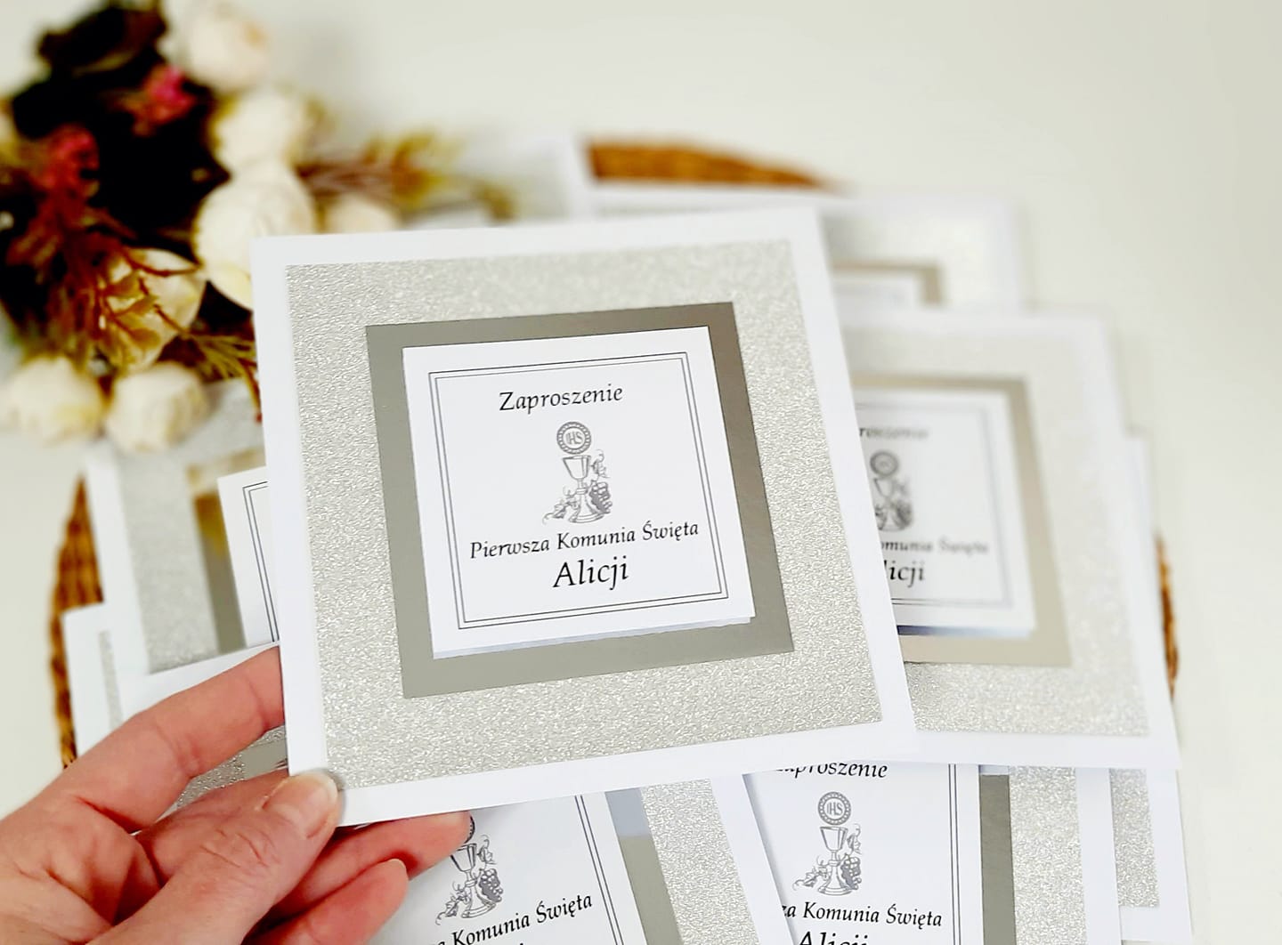 Eleganckie zaproszenia na komunię z szarym papierem brokatowym i lustrzanym oraz grafiką kielicha