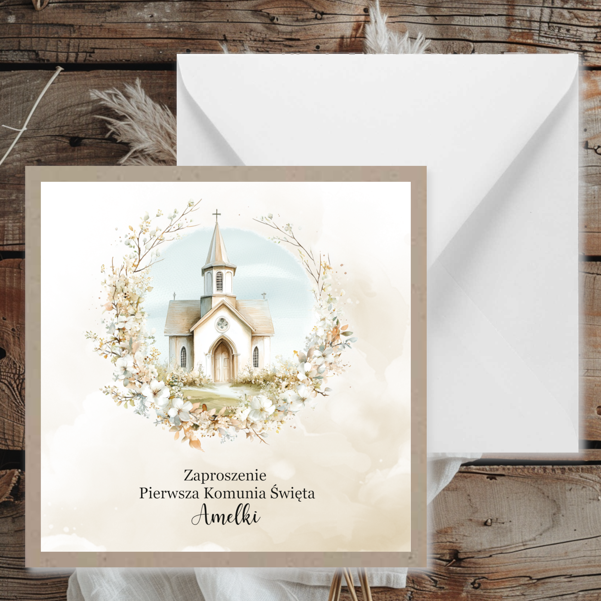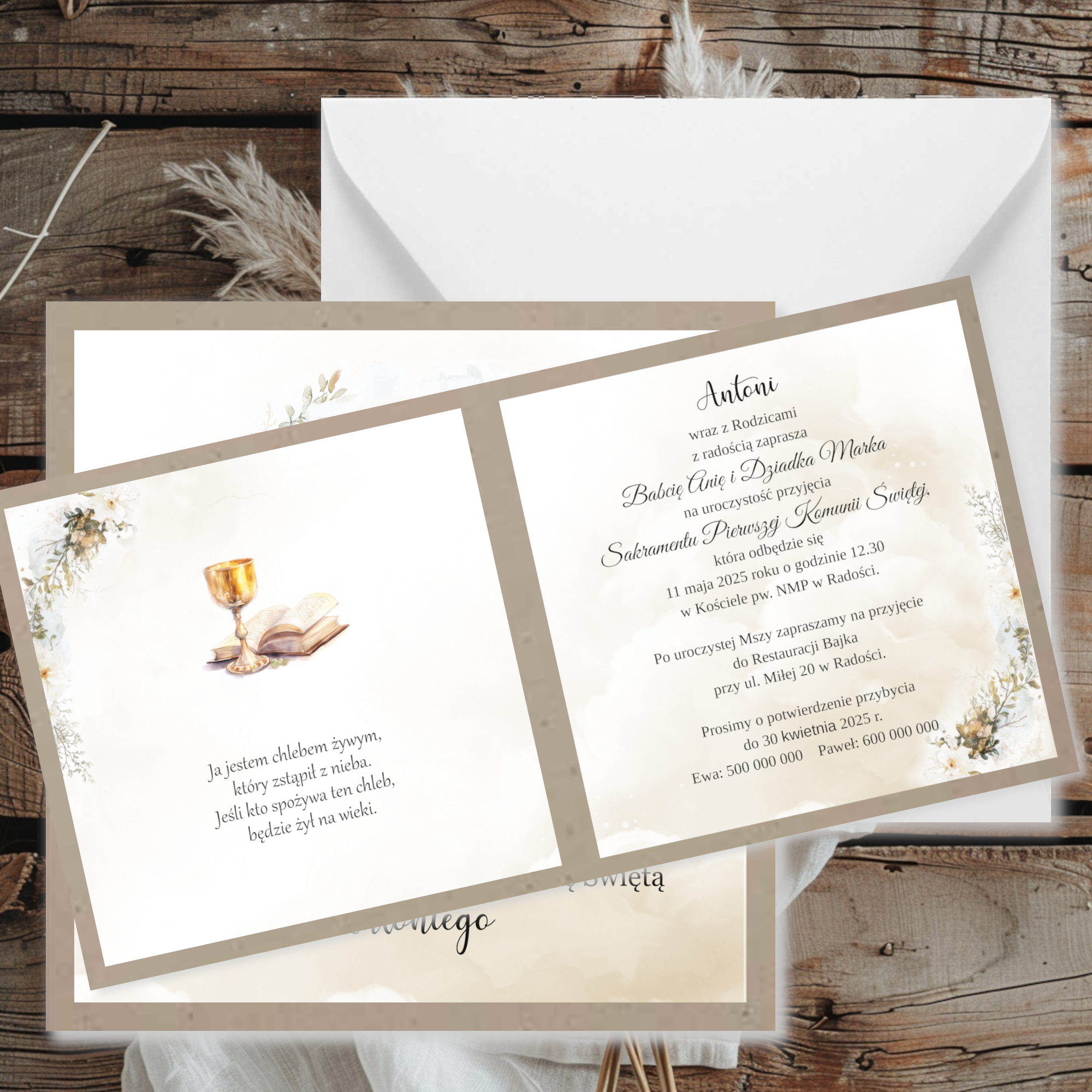Zaproszenia na komunię w uniwersalnej kolorystyce z grafiką oraz papierem kraftowym
