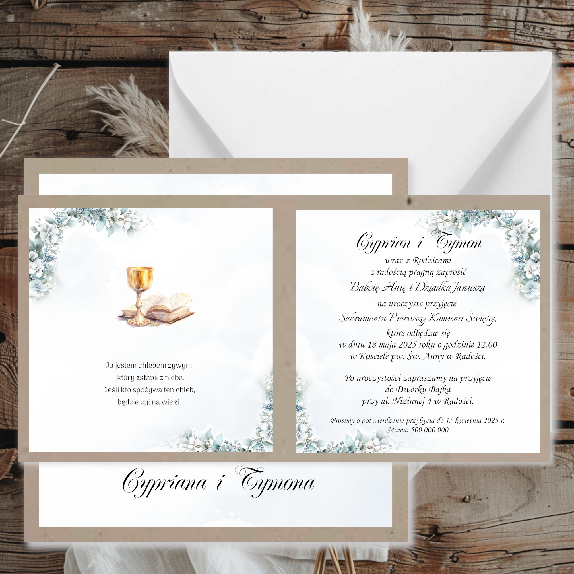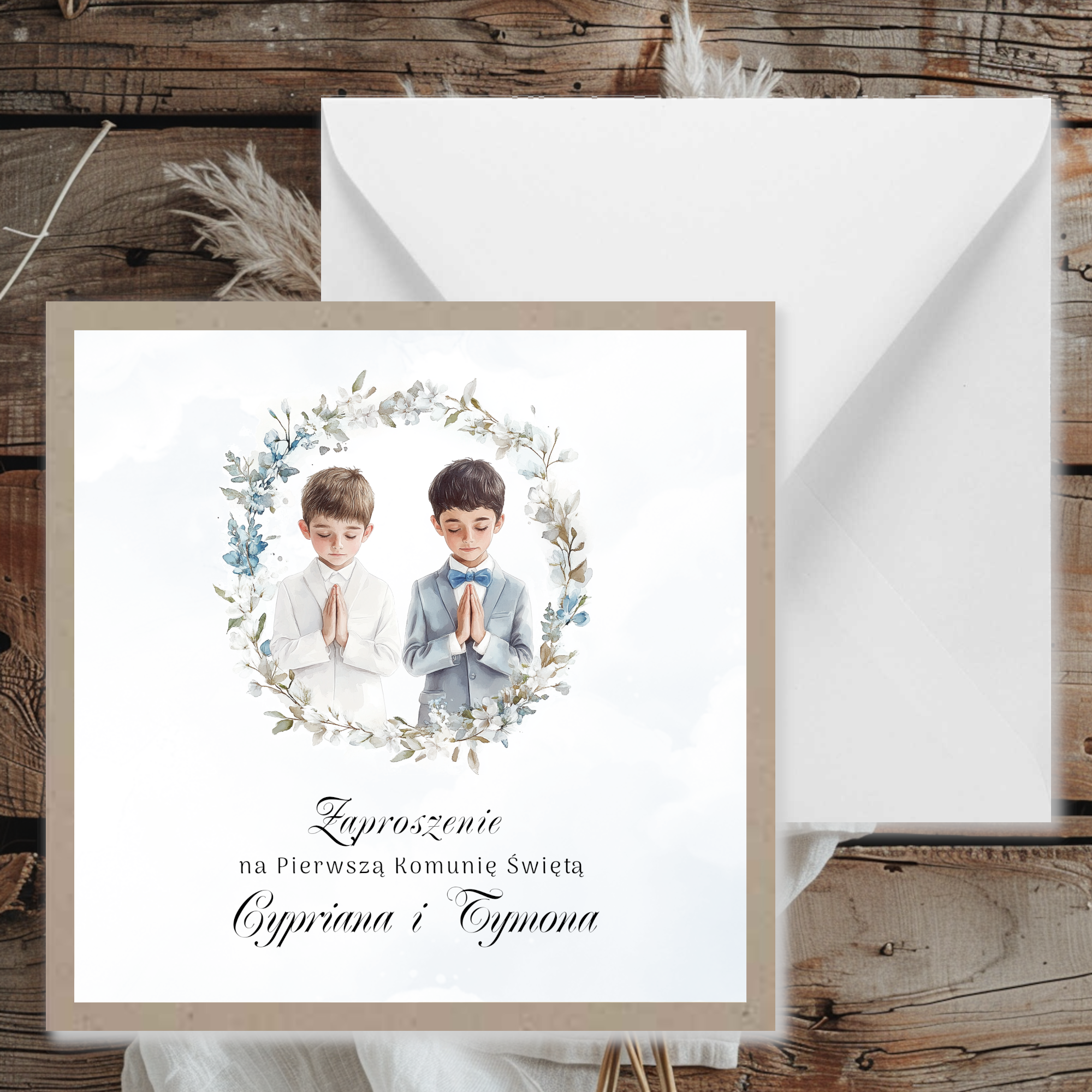Zaproszenia na komunię w uniwersalnej kolorystyce z grafiką oraz papierem kraftowym