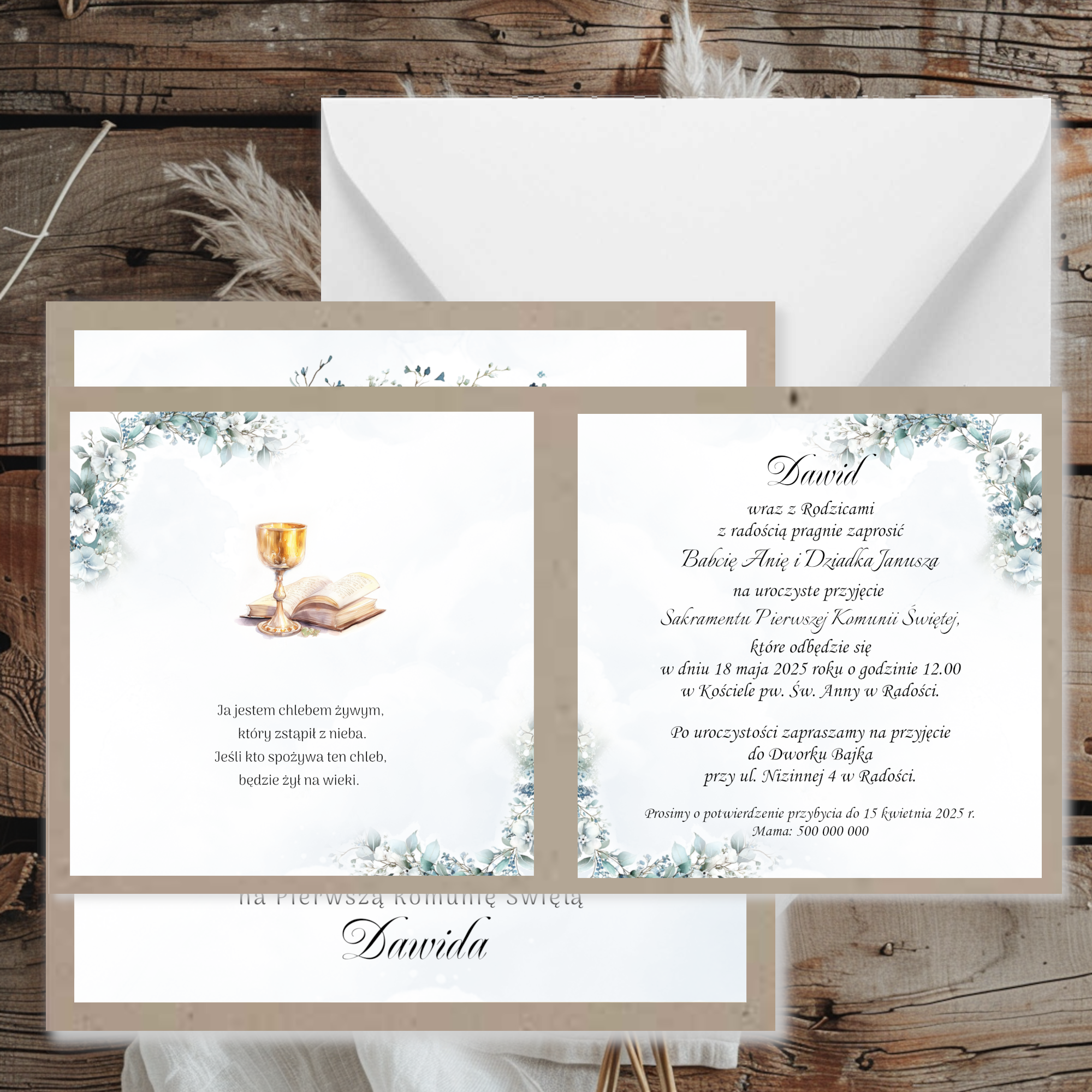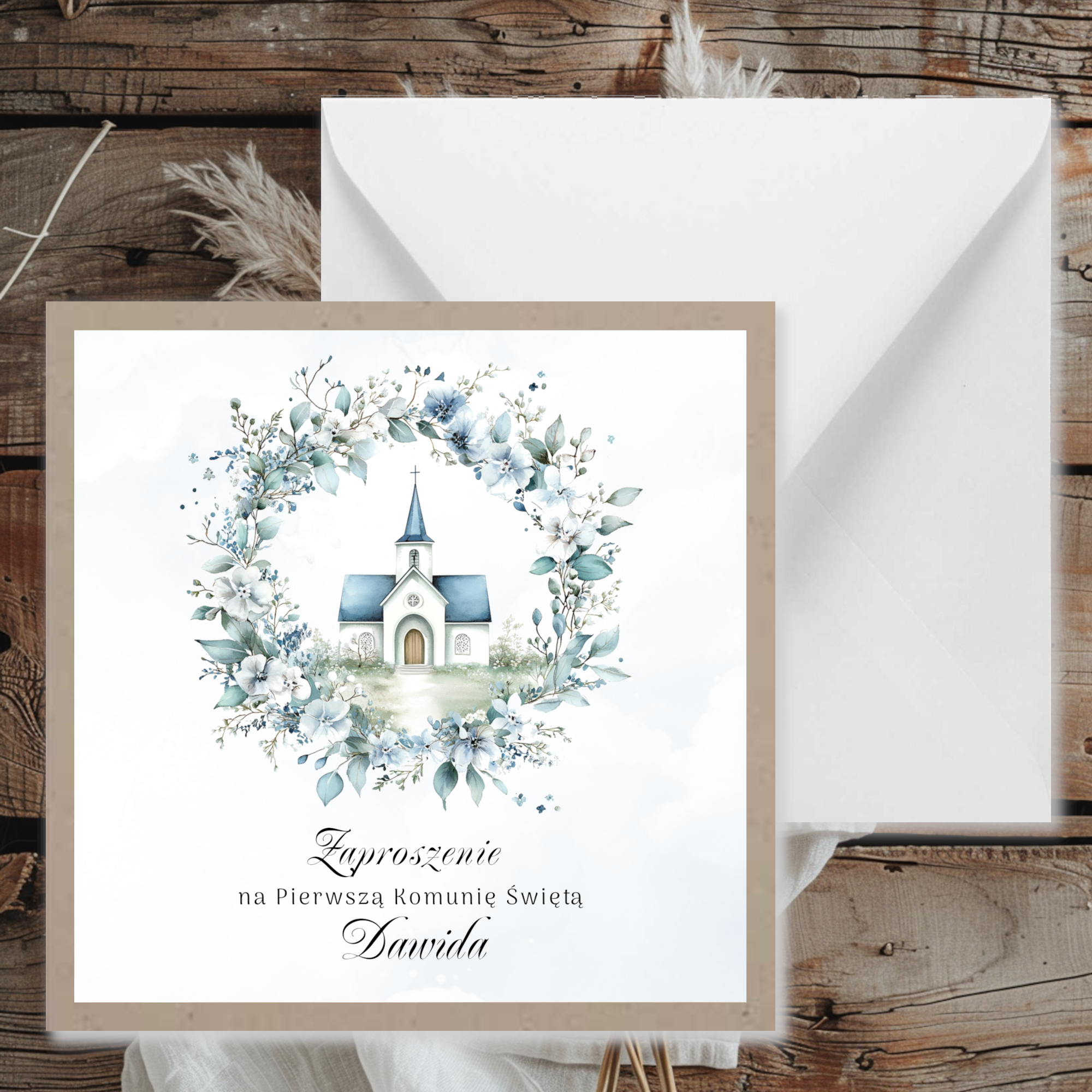 Zaproszenia na komunię w uniwersalnej kolorystyce z grafiką oraz papierem kraftowym
